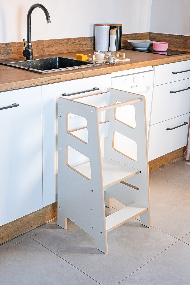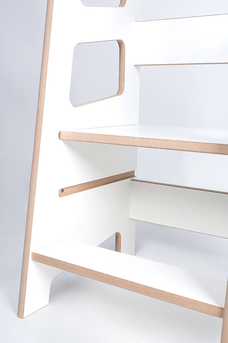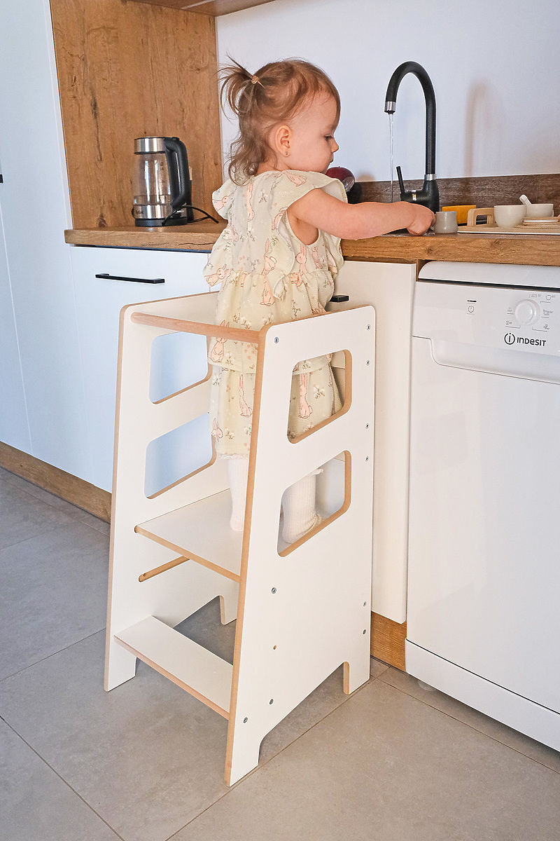 Children's montessori learning tower in white design with trapezoidal cutouts. It is a reliable and practical helper that develops creativity, motor skills and also has a positive effect on the overall development and socialization of the child.