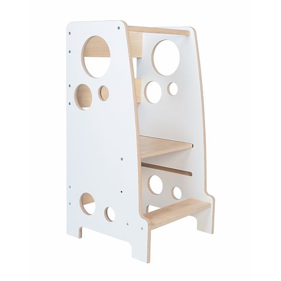 Children's montessori learning tower in white design with circular cutouts and brown steps. It is a reliable and practical helper that develops creativity, .. more