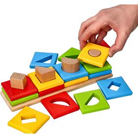 There are four pegs of different shapes on the wooden base: circle, triangle, crescent and rectangle. The child's task is to place wooden elements that match their shape on the individual pegs.