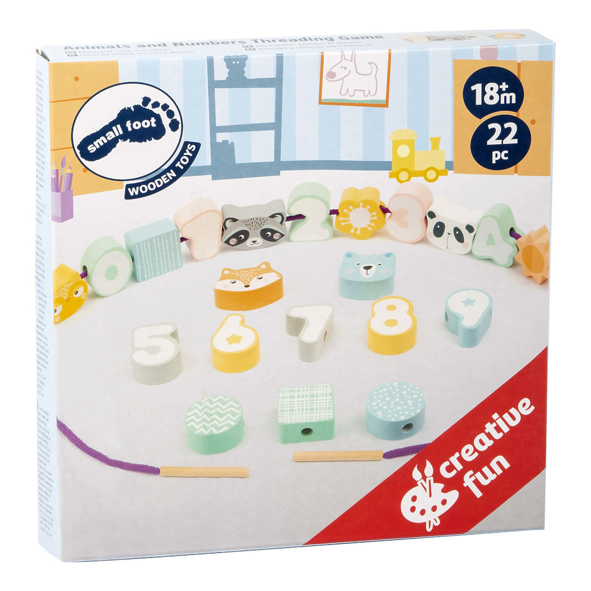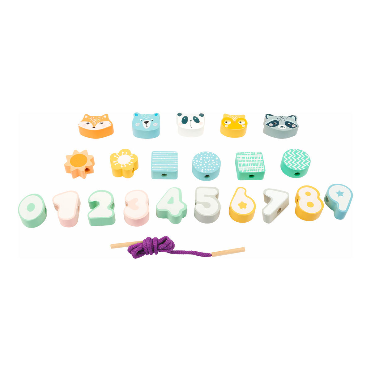 A fun game with threads and numbers in pastel colors! The object of this game is to string the numbers 0-9 in the correct order. The wooden ends of the strings help children with stringing and they can create different combinations with numbers and animals according to their imagination.