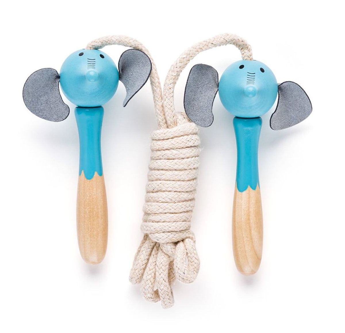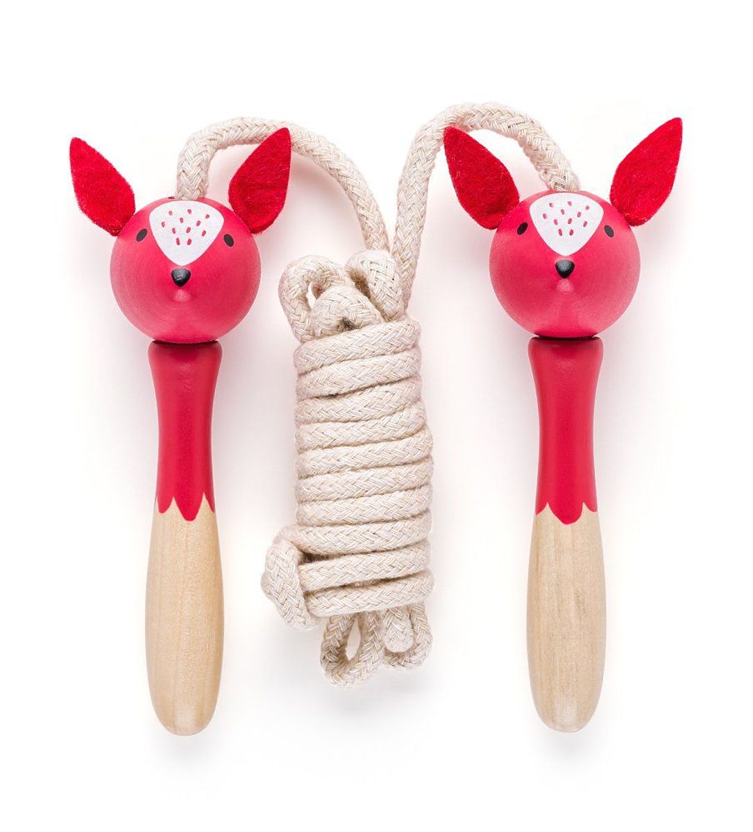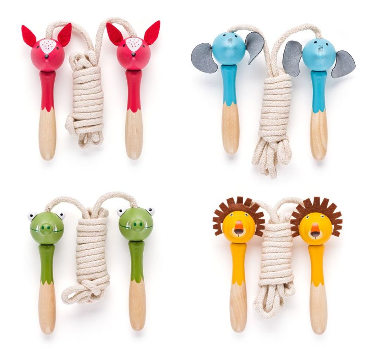 Each jump rope has a handle made of lacquered wood in the shape of an animal with felt accessories like a lion's mane or a deer's ears and a fabric rope.