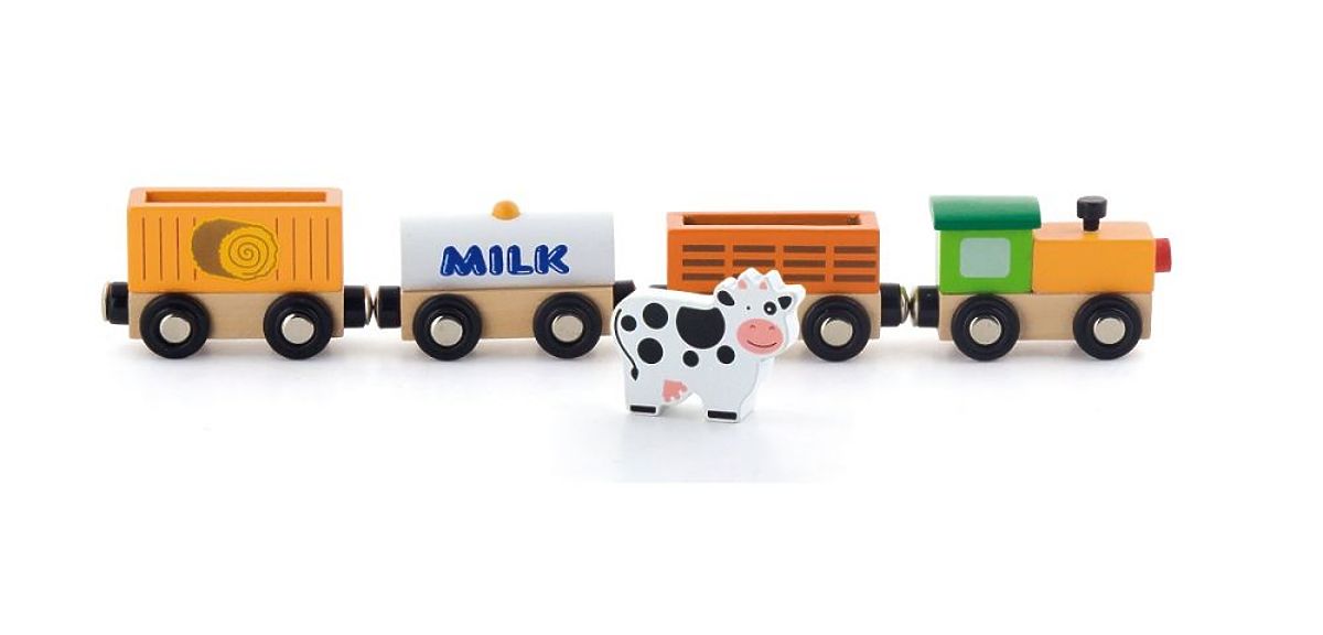 The locomotive pulls three carriages: one with straw, the second with milk, and the third with a cow. Of course, after transporting to the farm, you can unload the cow and leave it at the new farmstead.