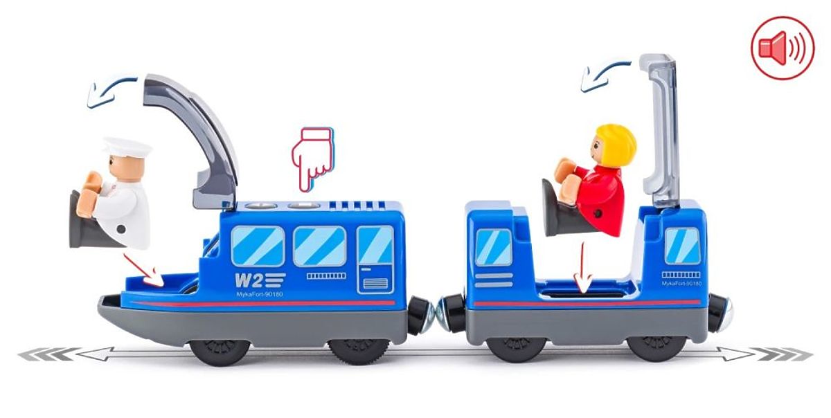 The locomotive makes a wonderful impression on a child as it moves along the tracks without any assistance. Another attraction is the opening flaps for the driver and passenger. Once opened, they can be removed. The figures have movable limbs. Good adhesion of the wagons to the locomotive is ensured by a magnet placed at its end.