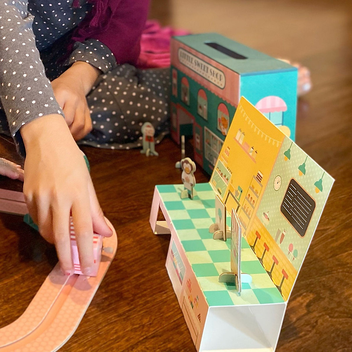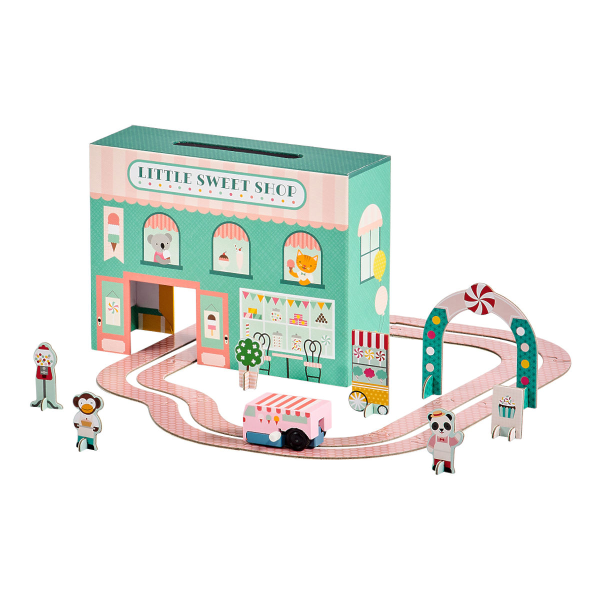 Time for a sweet reward! Pull back the ice cream truck and watch it drive around the sweet shop to its destination! A perfect toy for hours of imaginative play. The box can be easily carried thanks to its rope handle. Main features: double-sided sweet shop, wooden pull-back ice cream truck, 8 pieces of track, 10 additional play pieces, easy-to-assemble track, packaged without plastic with environmental consideration, suitable for home and travel, for children aged 3 and up. The FSC® (Forest Stewardship Council) brand and certificate guarantee that the wood used in the product was not harvested illegally and comes from forests managed in an environmentally friendly or nature-friendly manner, where strict environmental and social requirements are met. The FSC® label on the product means that by purchasing it, you help protect forests and support sustainable, responsible, or nature-friendly management, making our forests more stable, healthier, naturally diverse, and better able to withstand the negative impacts of climate change.