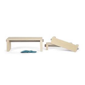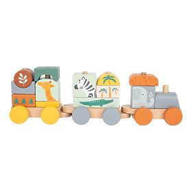 Fold it up and head out of the station! This wooden train in trendy colors does not start until all the passengers have boarded - a zebra, an elephant, a giraffe and a crocodile. The train with many details is also a plug-in toy that gives children freedom when folding – each cube fits in several places. Next stop: Safari! The toy trains children's motor skills. Main features: illustrated, pastel colored locomotive, 2 carriages and 13 parts