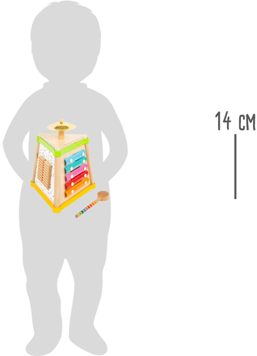 Music and tones will surely cheer you up! This colorful wooden truncated pyramid offers various options for creating rhythmic sounds on its three sides. It features a rattle, a mini xylophone, and a drum. A small cymbal at the top produces a ringing sound. This versatile sound set gives the green light to a musical show! It is not a musical instrument, but a toy. Main features: 4 sound instruments and a stick, trains hearing, fine motor skills, and sense of rhythm