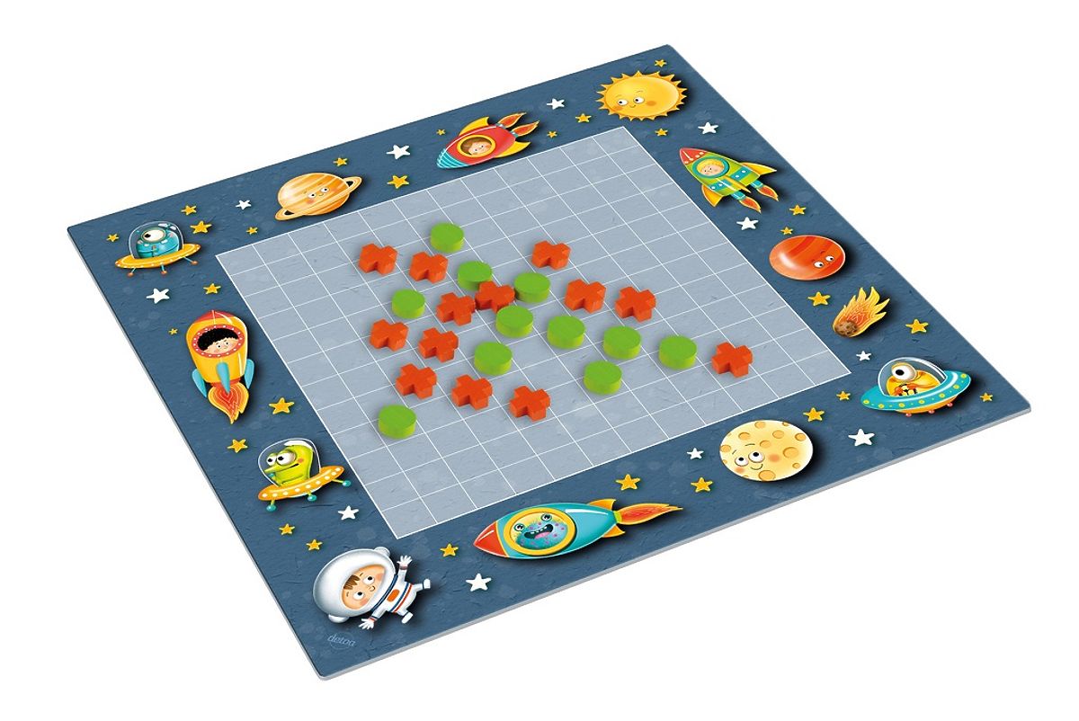 Play the traditional and popular strategic game for two players with a double-sided game board featuring space and underwater world themes. The first player to place their 5 game pieces in a row vertically, horizontally, or diagonally wins! Package contents: 1x double-sided game board made of hard cardboard, 70 game pieces (35 circles and 35 crosses). Main features: supports strategic and logical thinking, packed in a paper box to prevent loss, made in the Czech Republic.