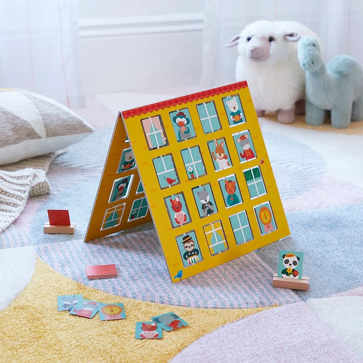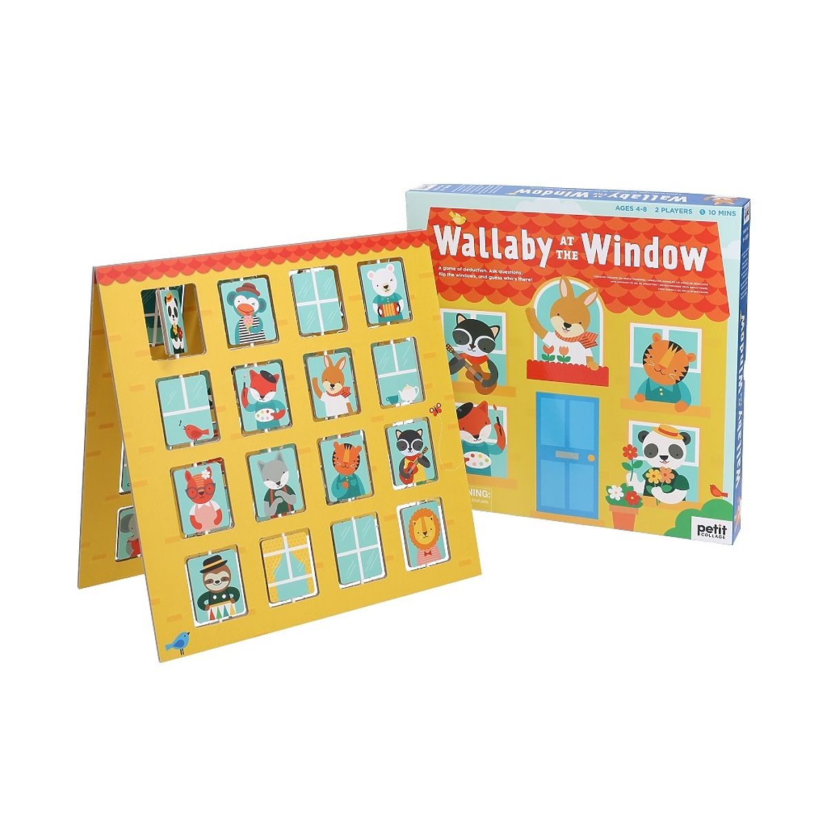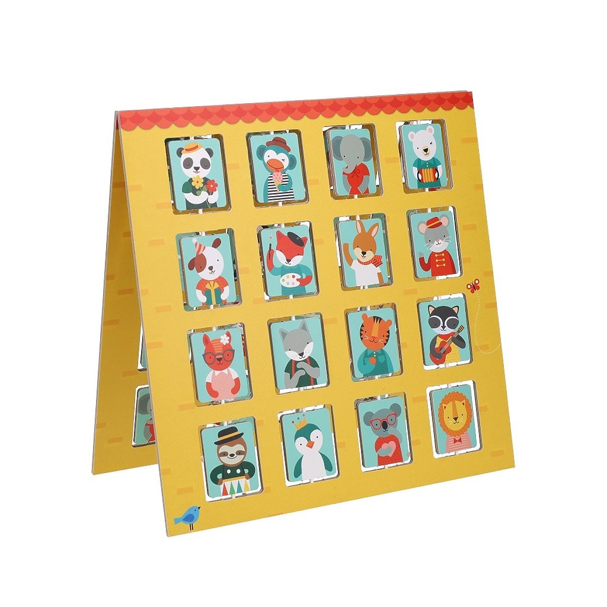 Knock, knock! Who's at the window? Is it a hungry monkey, a drumming sloth, or a waving Wallaby kangaroo? Guess who's in your opponent's window before they guess who's in yours. A classic and fun game for two players that features a unique double-sided game board with rotating windows. Made with the environment in mind, from 50% recycled materials and printed with vegetable inks on FSC paper. Suitable for children aged 4 to 8. In this animal-themed deduction game, players take turns guessing who the mysterious animal friend is by asking a series of questions. The package includes a double-sided game board, 16 animal illustration cards, 2 animal character stands, and instructions. Main features: includes a unique double-sided plastic-free game board with flip windows, made from 50% recycled materials and printed with vegetable inks, meets all European safety standards, average gameplay of 10 minutes, suitable for children aged 4 to 8. The FSC® (Forest Stewardship Council) brand and certificate guarantee that the wood used for the product was not illegally harvested and comes from forests managed in an environmentally friendly or nature-friendly manner, where strict environmental and social requirements are met. The FSC® label on the product means that by purchasing it, you help protect forests and support sustainable, responsible, or nature-friendly management, making our forests more stable, healthier, naturally diverse, and better able to withstand the negative impacts of climate change.