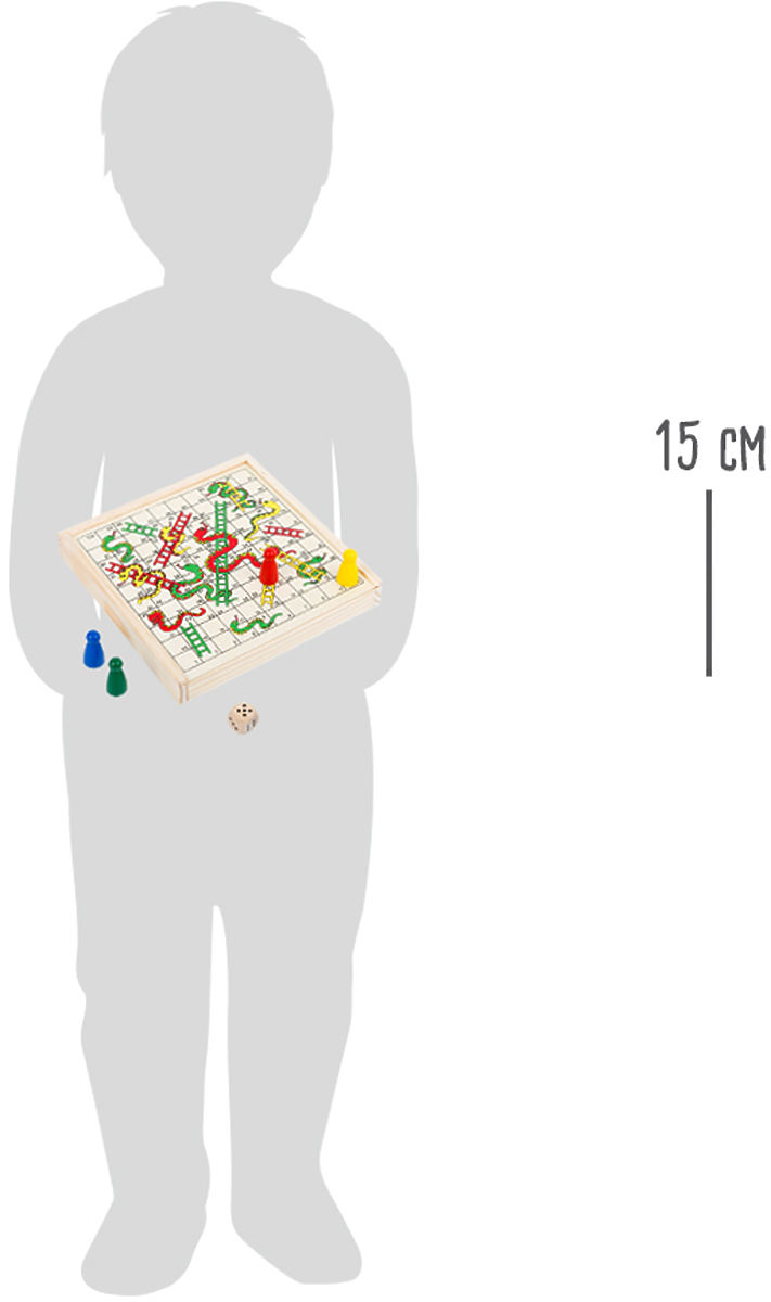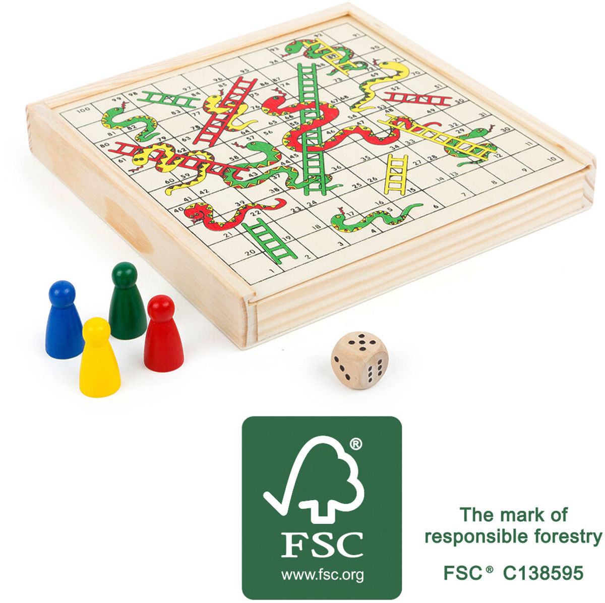 Four players, a die, and a game board with snakes and ladders. Who will reach from 1 to 100 the fastest? This compact board game is made from 100% FSC wood. Landing on a snake or ladder square makes the path to the finish longer or shorter. This board game is perfect for travel. The pieces are safely stored inside the box, which serves as the game board. Main features: 100% FSC wood travel game trains patience. The FSC® (Forest Stewardship Council) brand and certificate guarantee that the wood used to make the product was not illegally harvested and comes from forests managed in an environmentally friendly or nature-close manner, where strict environmental and social requirements are met. The FSC® label on the product means that your purchase helps protect forests and supports sustainable, responsible, or nature-friendly management, making our forests more stable, healthier, with a natural species composition, and better able to withstand the negative impacts of climate change.