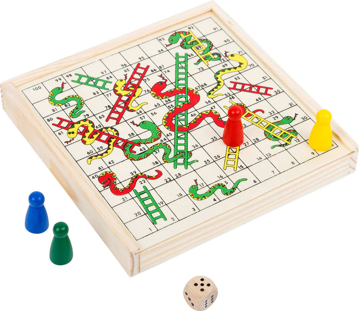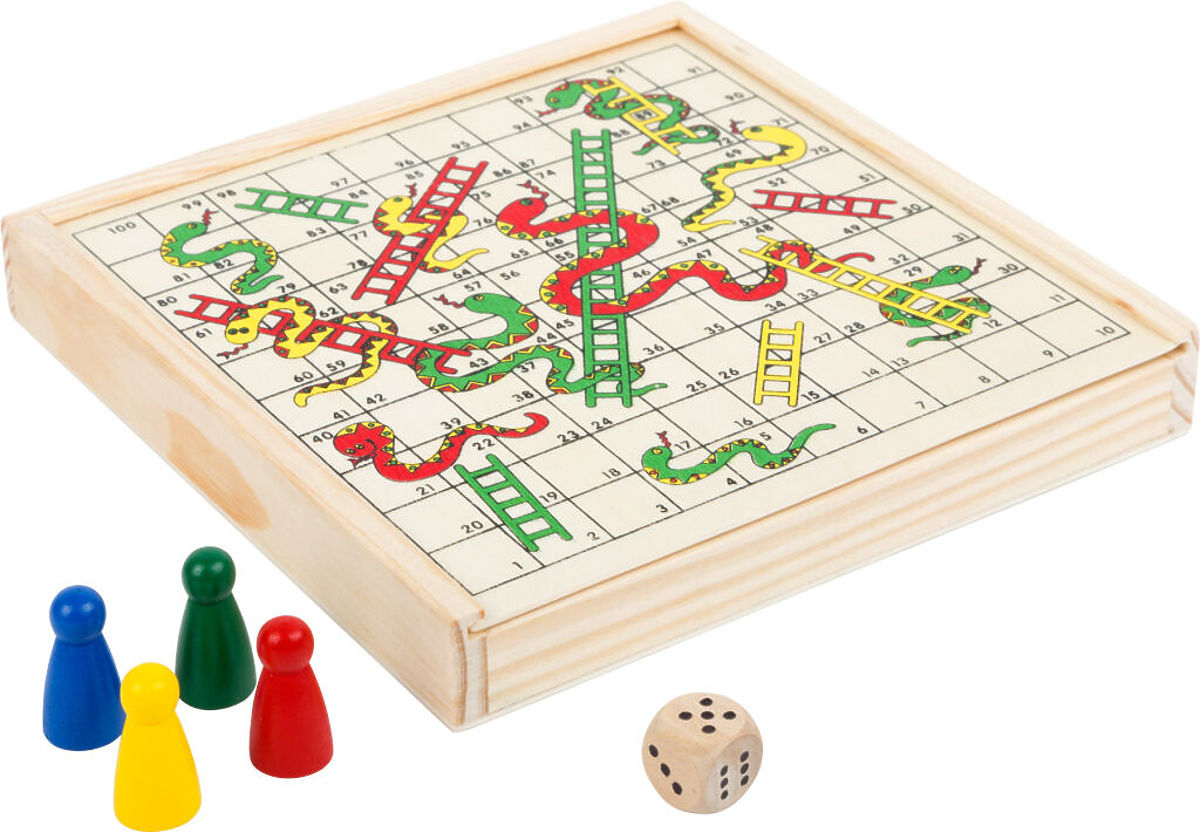 Four players, a die, and a game board with snakes and ladders. Who will reach from 1 to 100 the fastest? This compact board game is made from 100% FSC wood. .. more
