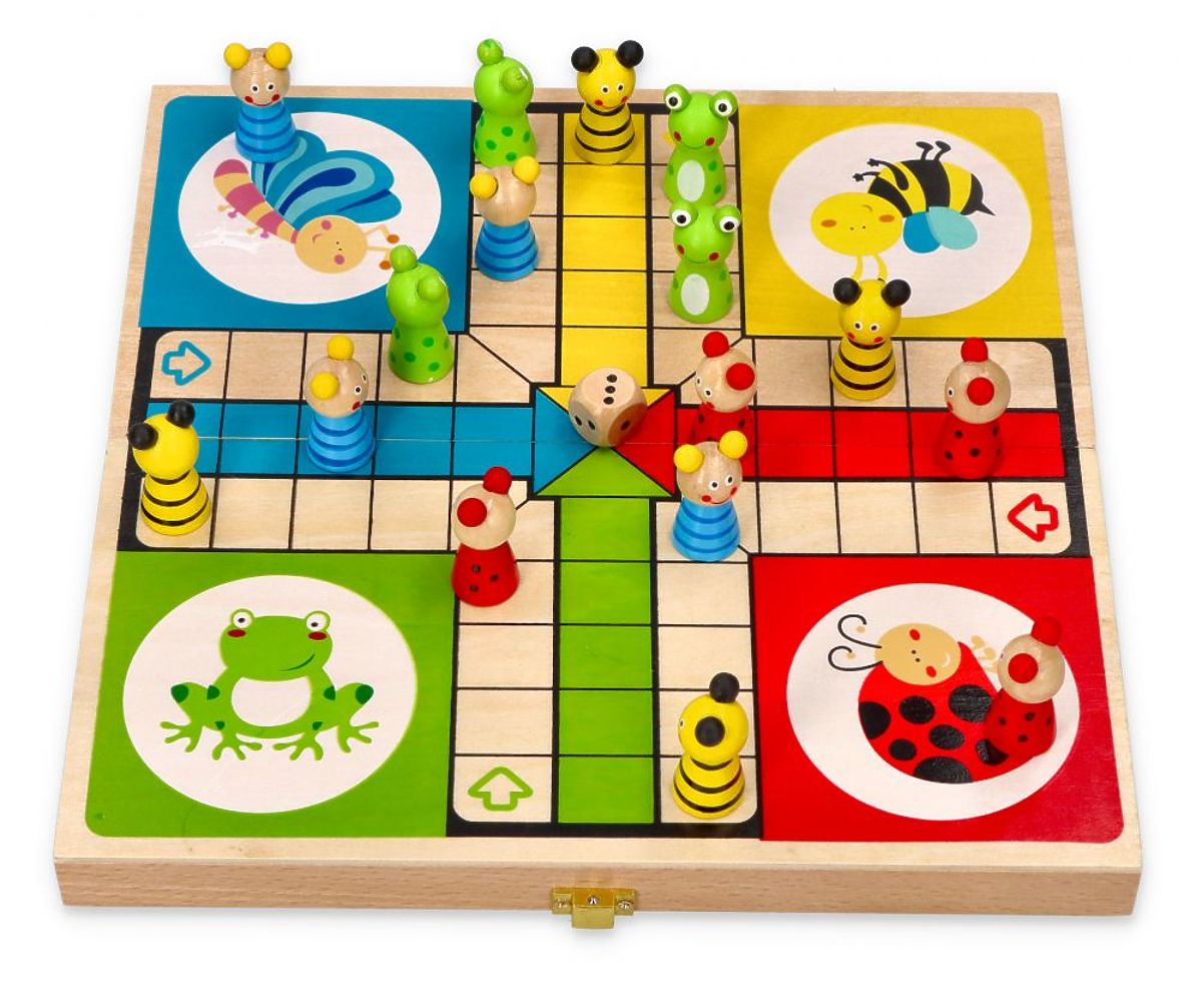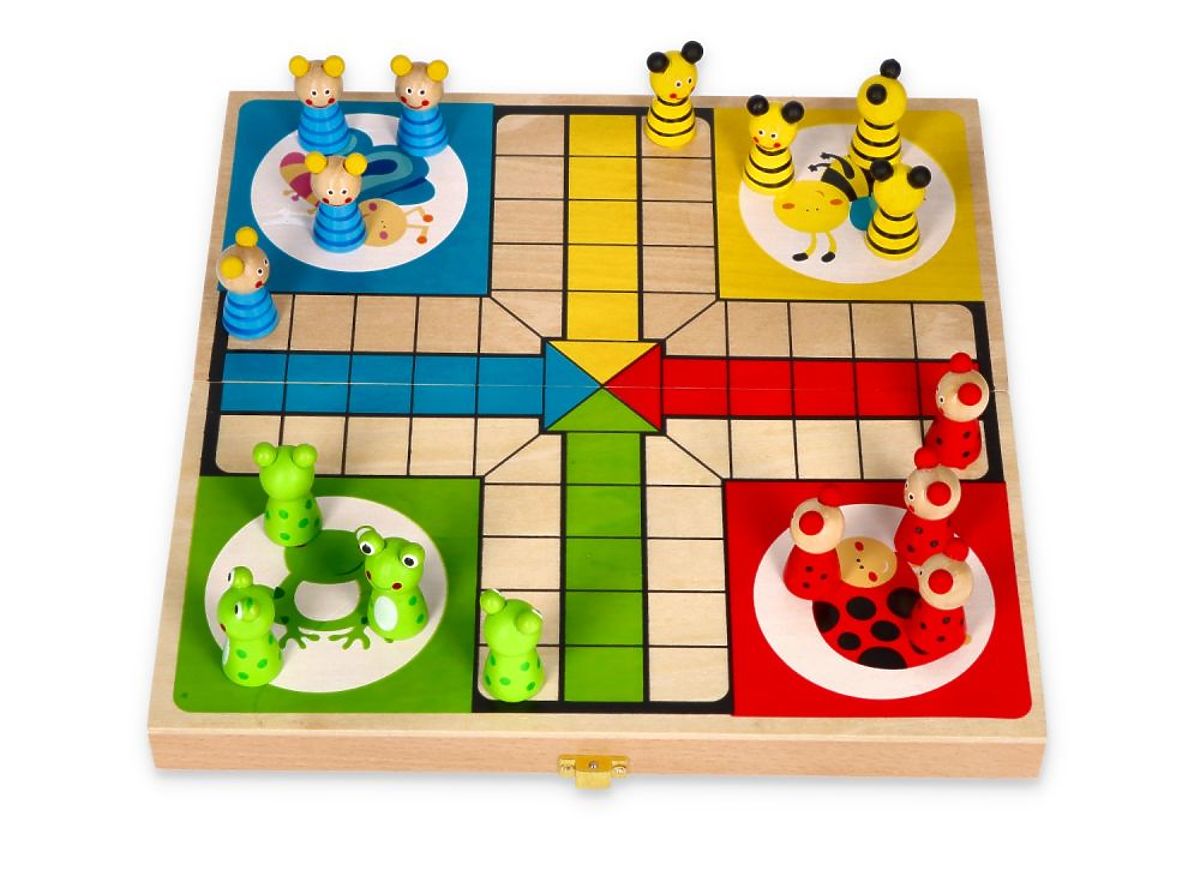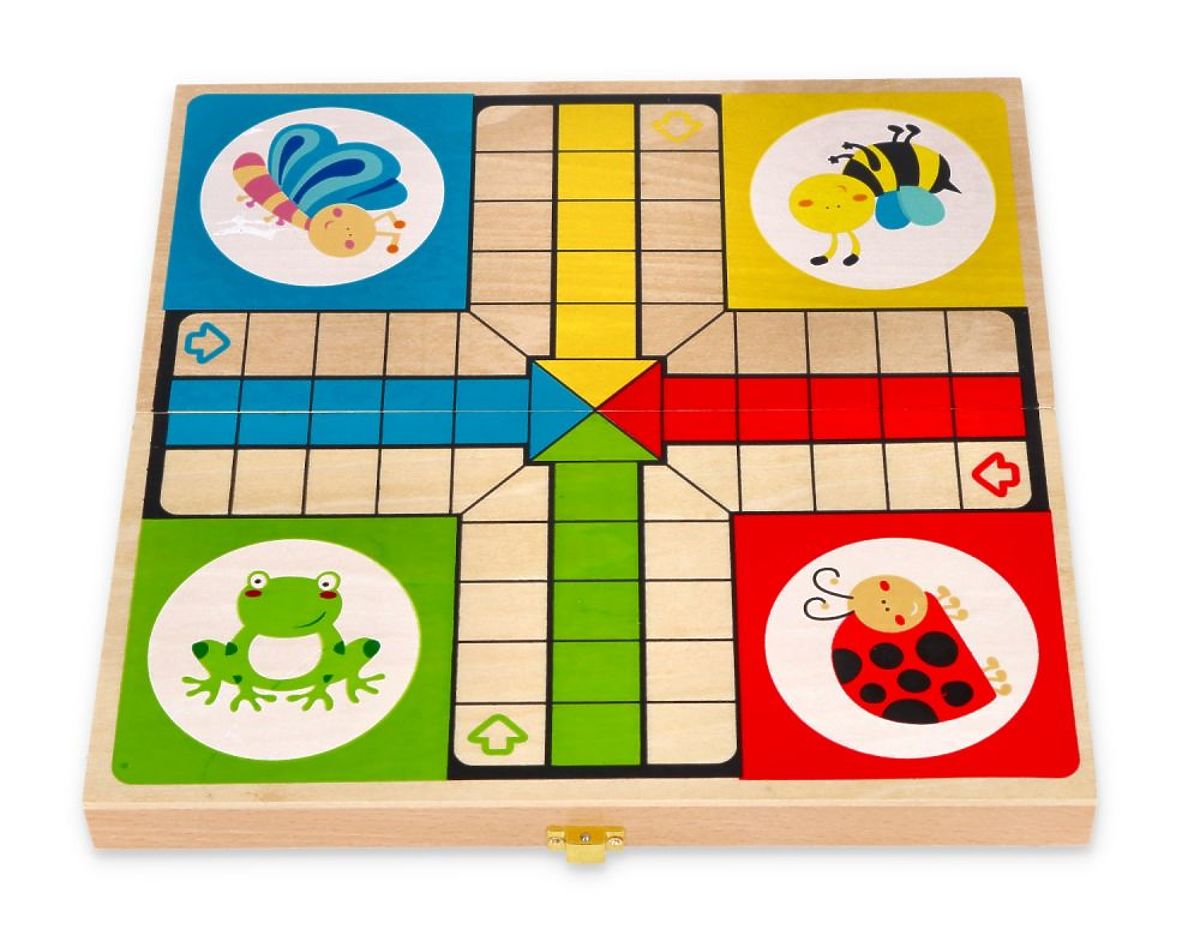 The wooden board also serves as a box for the pieces, closable with a latch. The set includes 4 dice, so each player has their own.