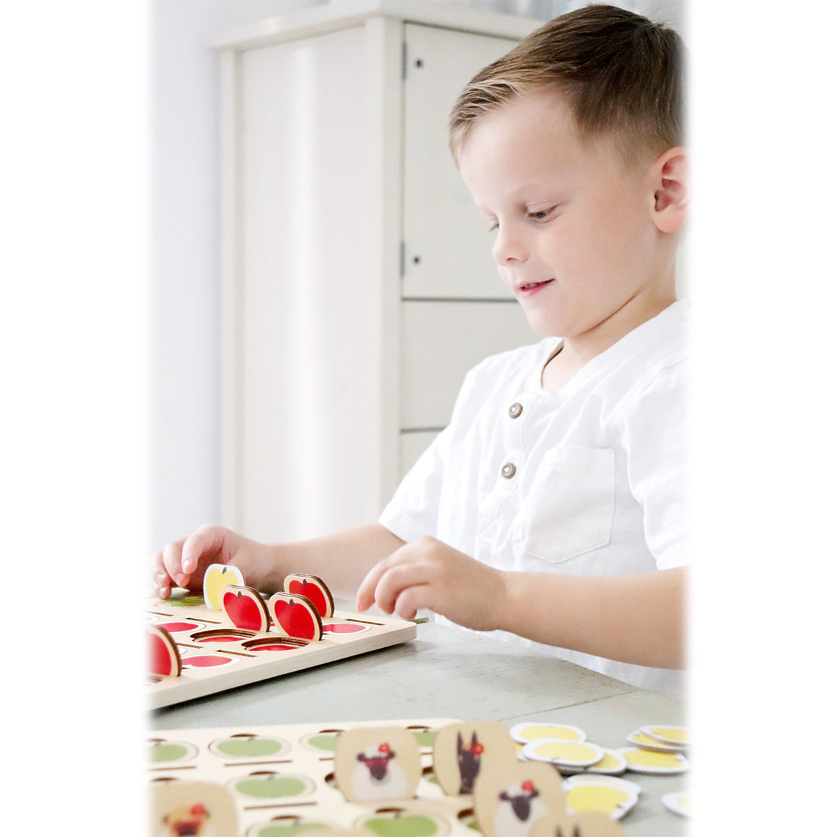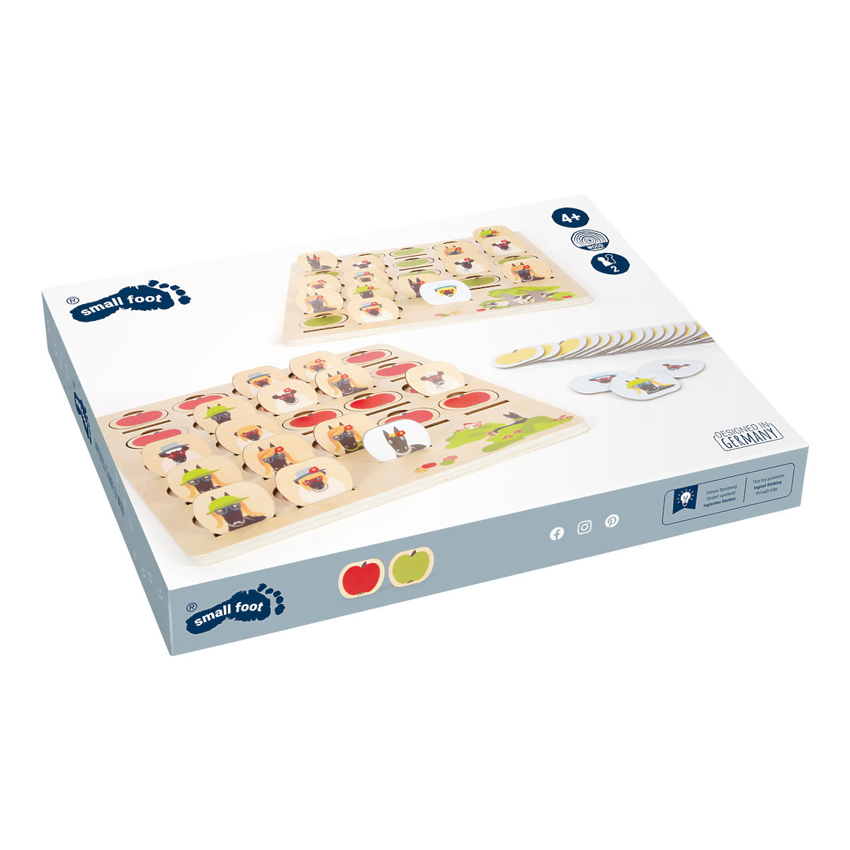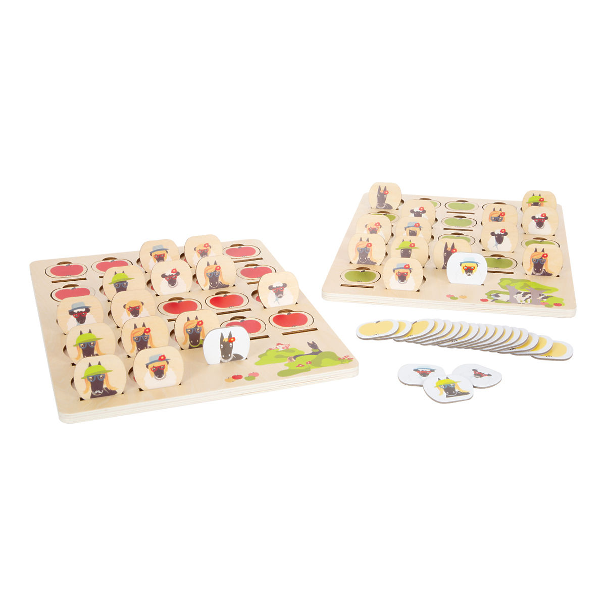 Who took the apples? With this game, the whole family can guess, and you'll need good observation skills to quickly identify the "4 friends" character. The classic game is made from sturdy wood and features a child-friendly design. The package includes 2 game boards on which you arrange illustrated pieces, and 22 cardboard character cards. 2 in 1, it can also be played as a memory game. Stored in a quality box. Cow Olga and rooster Heinz are trying to find out who stole the apples from the meadow, but the suspects are well hidden! The game is suitable for introducing the world of similarities and differences. This board game has very simple rules and is suitable for people of all ages. It helps develop combination skills and trains concentration. Main features: popular game with simple rules made from sturdy wood, two game boards, 22 cardboard cards, 2 in 1, can also be used as a memory game, quality storage box, supports the development of combination skills and trains concentration, compatible with other "4 friends" games.
