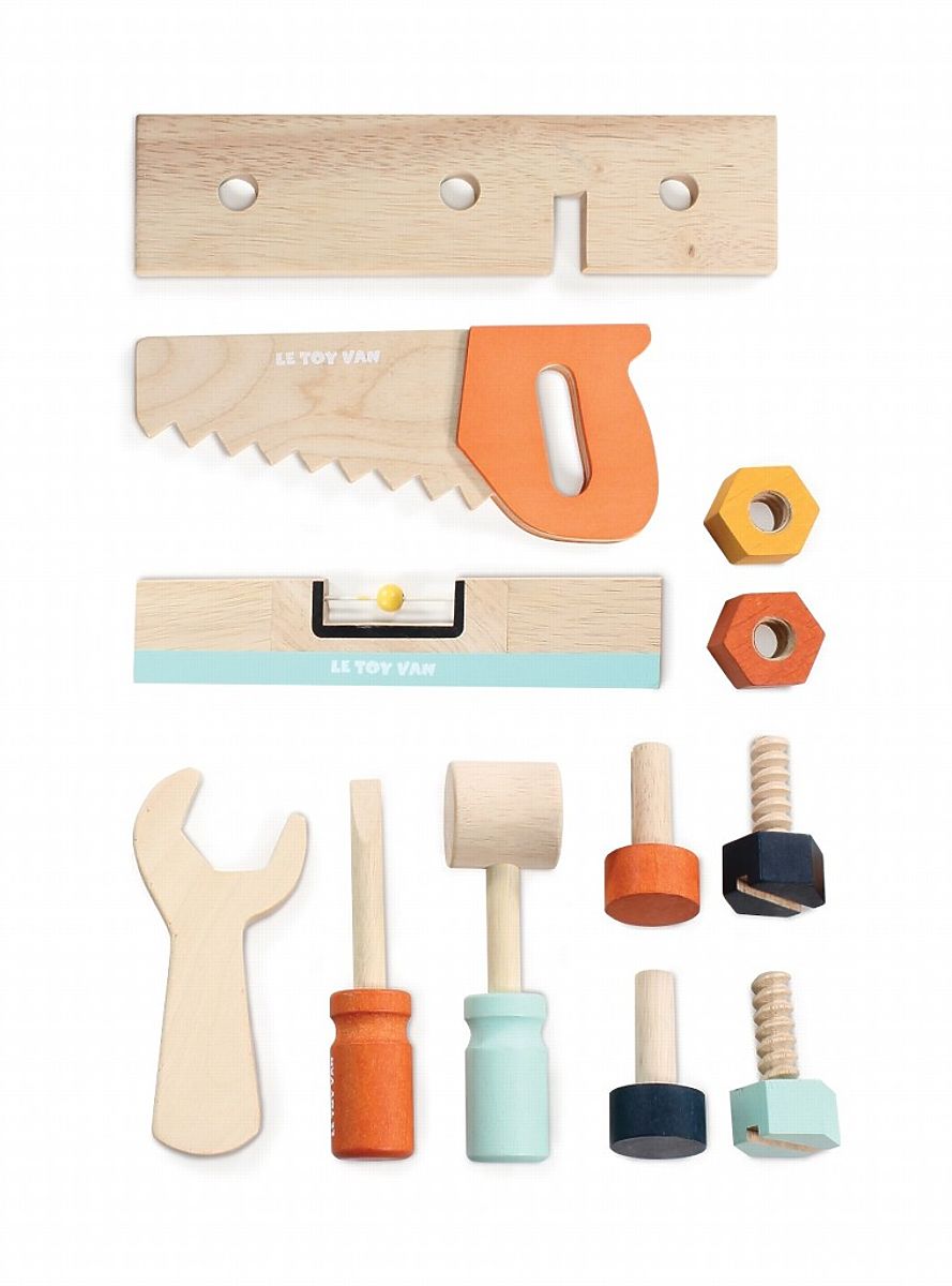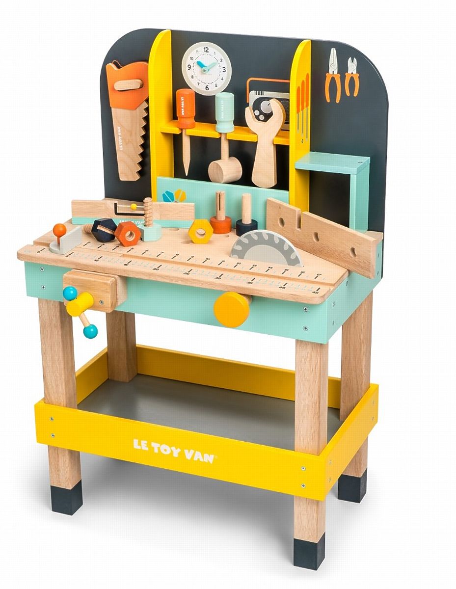 Get ready for eco-friendly fun with tools. This robust workbench will truly surprise you; it's a product that has won many awards. This colorful toy is made from durable and sustainable rubberwood and is painted with non-toxic water-based paints. The package includes 12 chunky wooden accessories, perfectly sized for children's hands: a saw, hammer, screwdriver, wrench, spirit level, 2 bolts, 2 screws, 2 nails, and a wooden board. The realistic workbench, which children will love, features a built-in circular saw, gauge, and vise. On the back wall, you'll find a shelf and hooks for tools. At the bottom, there is additional storage space for all the parts that need fixing. The toy is complemented by captivating illustrations, and imaginative play will literally absorb the children. Toys with a Purpose: All Le Toy Van toys are made to last. Designed with love by experienced craftsmen using ethical practices and sustainable materials that are kinder to our planet. Key features: ethically made from sustainable wood, tested to the strictest standards, painted with non-toxic water-based paints, inspires imaginative play, develops cognitive skills. Toy Awards: Dadsnet Toy Silver Award 2020. Cars & Construction: The Le Toy Van construction and motor skills collection, which has won many awards. Specifically, over 15 awards for imaginative cars and construction toys so far. They support children's imagination, are perfect for imaginative play, develop creativity, and playfully improve children's hand-eye coordination. The FSC® (Forest Stewardship Council) brand and certificate guarantee that the wood from which the product was made was not illegally harvested and comes from forests managed in an environmentally friendly or nature-friendly way, where strict environmental and social requirements are met. The FSC® mark on the product means that by purchasing it, you help protect forests and support sustainable, responsible, or nature-friendly management, making our forests more stable, healthier, have a natural species composition, and better withstand the negative impacts of climate change.