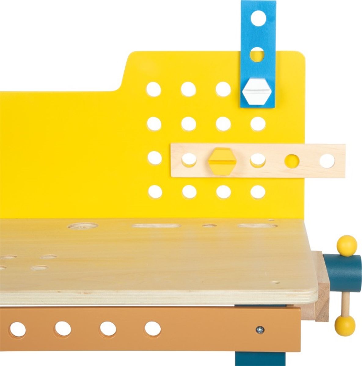 There's always so much work to do in the workshop! With this compact workbench featuring an integrated vise and storage space, children can test their handy skills by hammering, sawing, and screwing bolts. Realistically designed accessories and tools including a hammer, wrench, screwdriver, vise, and saw bring fun to play and motivate children to be creative and imaginative. A large number of accessories consisting of bolts, nuts, gears, a set of washers, and perforated plates in various shapes and sizes allow children to create their own projects or build a small race car according to the included instructions. Holes on the front and back as well as on the work surface can be used to attach accessories to the workbench using bolts. By playing with tools and engaging in DIY activities, children train motor skills and hand-eye coordination, learning to use tools and gaining manual dexterity in a playful way. The set includes: workbench with vise, hammer, wrench, screwdriver, saw, 2 large perforated plates, 1 medium perforated plate, 2 small perforated plates, 2 diamond-shaped perforated plates, 2 square perforated plates, 9 bolts, 3 nails, 6 nuts, 3 gears, 2 thin washers, and 4 thick washers. Main features: teaches children to use tools, trains fine and gross motor skills, develops hand-eye coordination and manual dexterity, great addition to other products in the Nordic and Miniwob series. Documentation: assembly instructions (DE, EN, FR, IT, ES), assembly instructions - car