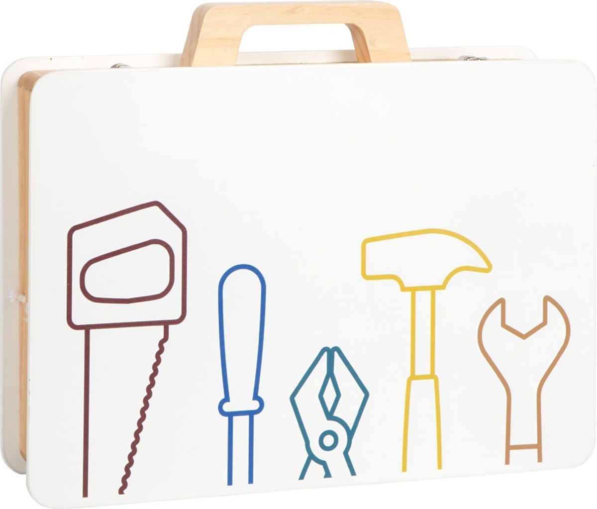 Attention all young craftsmen and craftswomen! With this wooden tool case, children can play as handymen. The realistic tools and accessories encourage creative play and develop imagination. Using the individual construction pieces, children can assemble various structures (e.g., a racing car, helicopter, windmill, or airplane) and thus develop their skills. The sturdy and durable case is equipped inside with rubber straps, keeping the individual tool pieces neatly organized. The case also features a metal clasp that keeps everything securely stored and a wooden handle adapted to the hands of young builders. The set includes: case, hammer, wrench, screwdriver, pliers, saw, 11 screws, 12 nuts, 2 rectangular perforated plates, 2 small perforated plates, 4 medium-sized perforated plates, 2 diamond-shaped perforated plates, 4 thick washers, 4 thin washers, 2 gears. Main features: robust and durable design, 5 wooden tools (hammer, wrench, screwdriver, pliers, and saw), comprehensive accessories including screws, nuts, gears, a set of washers, and perforated parts in various shapes and sizes, rubber straps in the case keep tools together during transport, metal clasp ensures numerous accessories are not lost, numerous play possibilities on the go, trains fine motor skills and concentration, develops imagination, practical and attractive packaging, perfectly complements other products in the Workshop range, compatible with Nordic and Miniwob product lines.