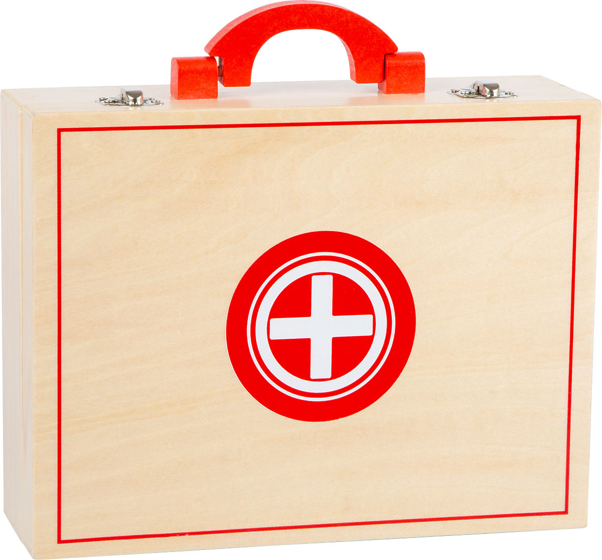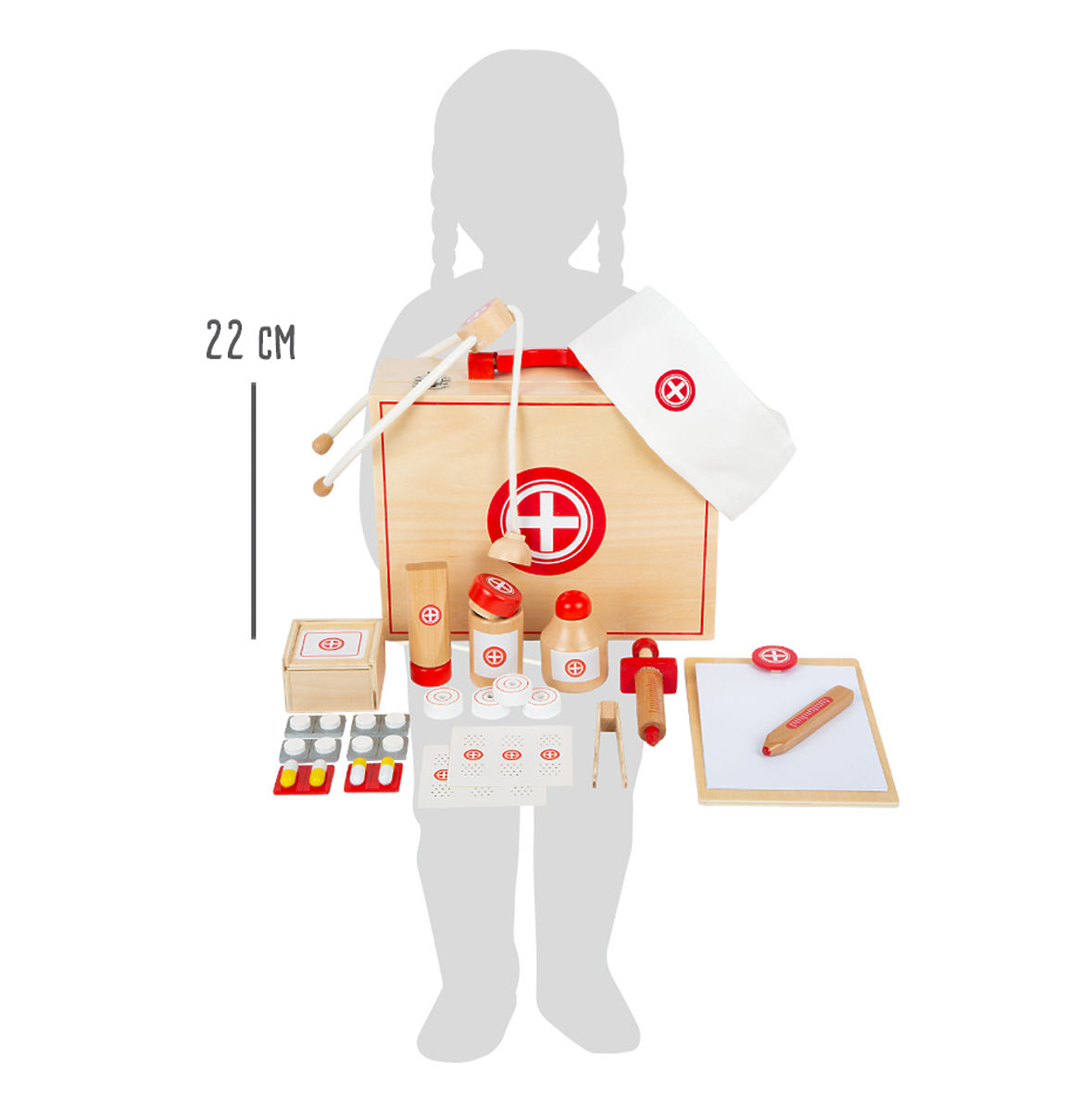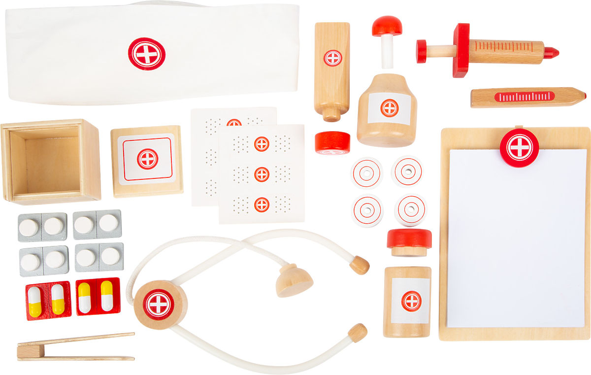 The doctors are on their way! Young doctors can equip themselves perfectly for their patient visits with this children's set. The kit contains all the essential medical tools and looks nice – it's fully wooden with classic white and red colors. Inside the kit, you'll find a tube of ointment, a tincture bottle, a stethoscope, a syringe, bandages, tablets, tweezers, a thermometer, and a notepad. Everything is, of course, intended for play and is made of wood or paper. It's a first aid kit for stuffed animals or dolls. Children can play doctor, which encourages creativity and gives them courage. All accessories fit comfortably in the case. Open your own practice! Main features: Wooden case with locks, Medicine bottles, stethoscope, syringe, thermometer, tweezers, In classic red and white colors