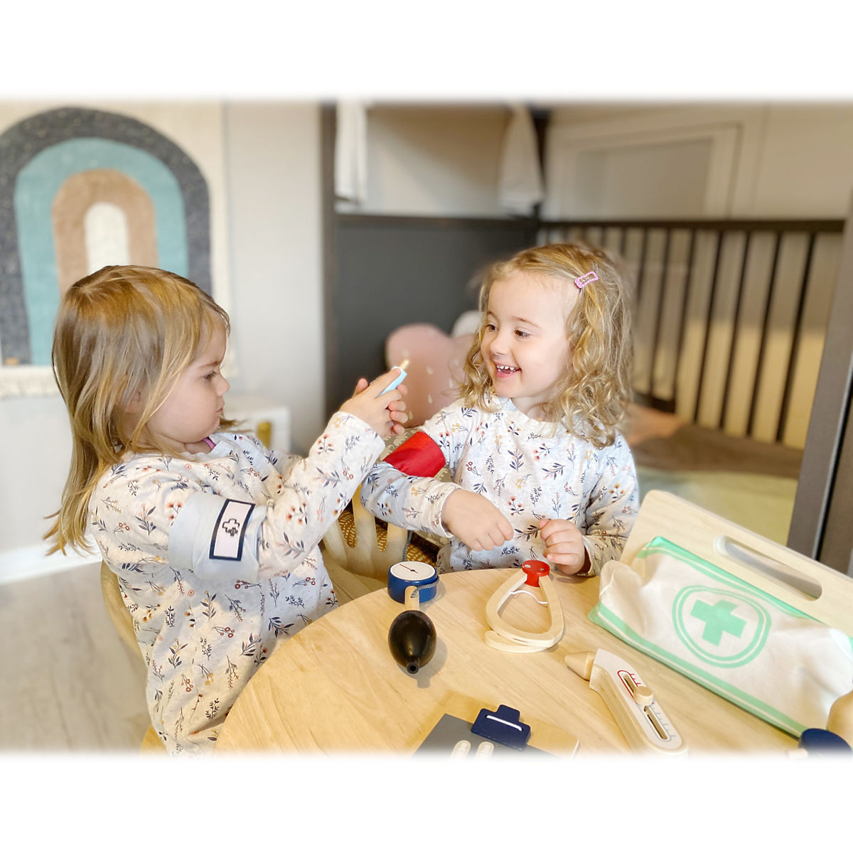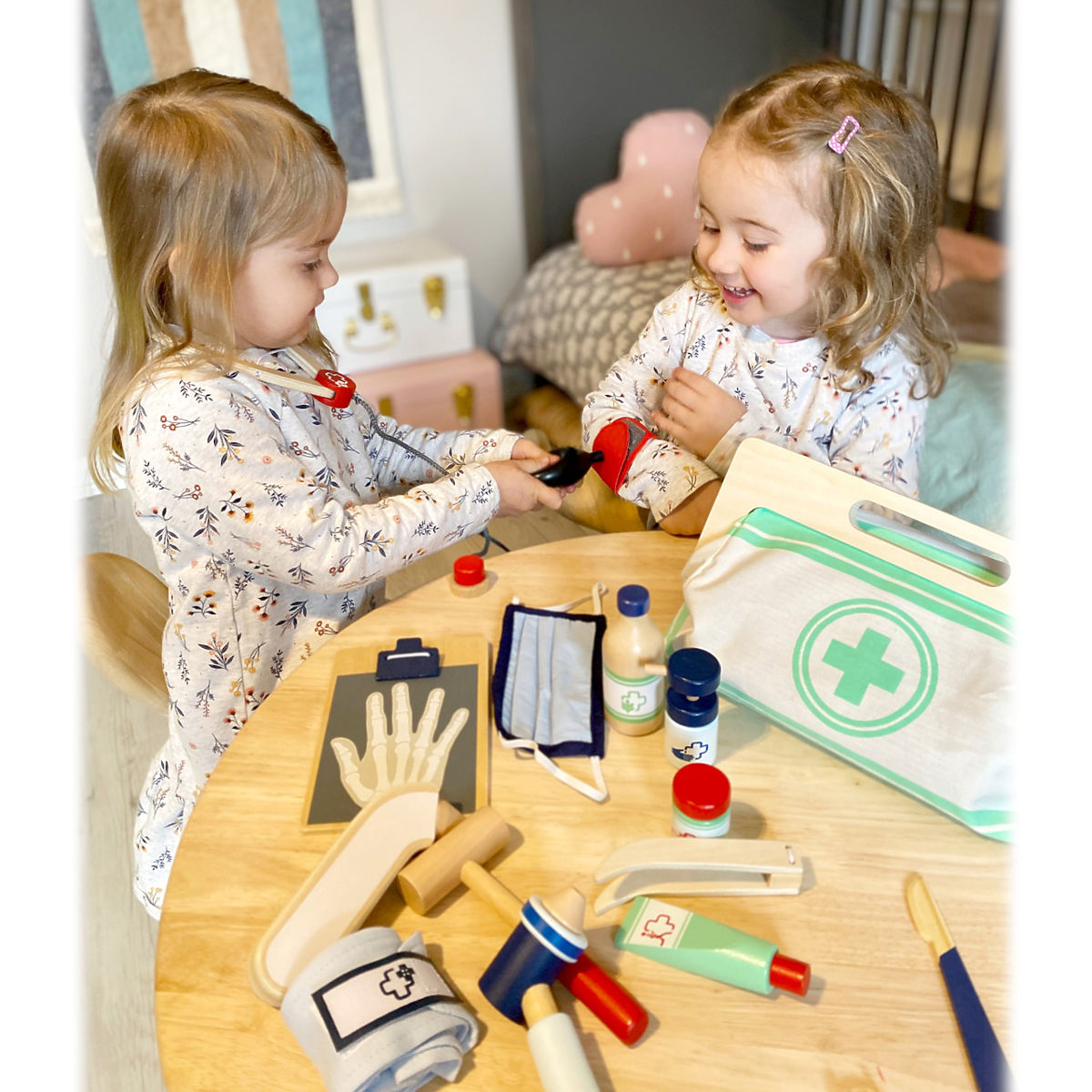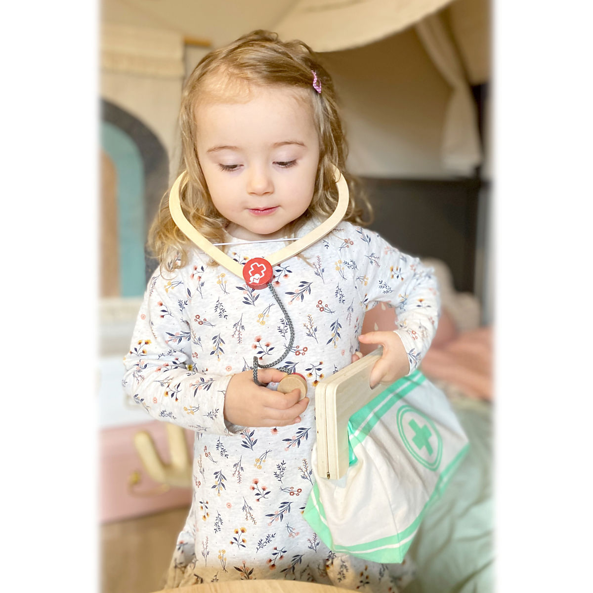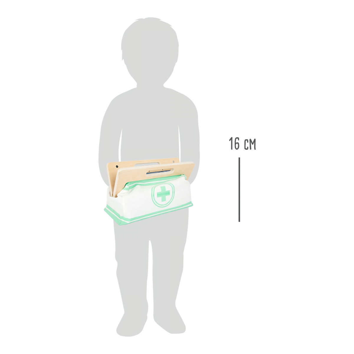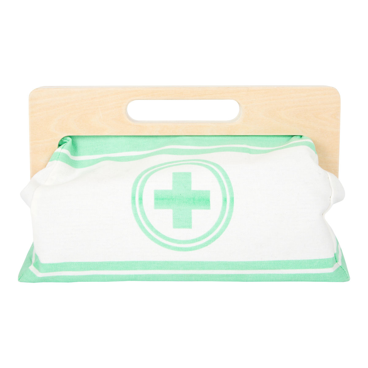 With this standard doctor's bag, young aspiring doctors will be perfectly equipped. The bag is made of soft textile, visually appealing and very functional. It can be easily opened thanks to magnets and is made of wood. Inside the bag, you'll find all the equipment for imaginative patient care: a stethoscope, thermometer, syringe, and much more – all made of sturdy wood! The best accessories are probably the blood pressure monitor with cuff and bulb, and the otoscope with magnifying glass. This comprehensive set of medical toys includes many "real" medical tools and instruments that children will truly enjoy playing with. Illustrations on the medical tools help children recognize the instruments and may also simplify their use. Main features: Doctor's bag with visible wood Blood pressure monitor with cuff and bulb Thermometer with adjustable temperature Otoscope with real magnifying glass Medicine bottle with screw cap Velcro bandages Reusable and washable children's textile masks Additional equipment: syringe with movable mechanism, stethoscope, disinfectant with pump, medicine bottle and spoon, tweezers, scalpel, reflex hammer