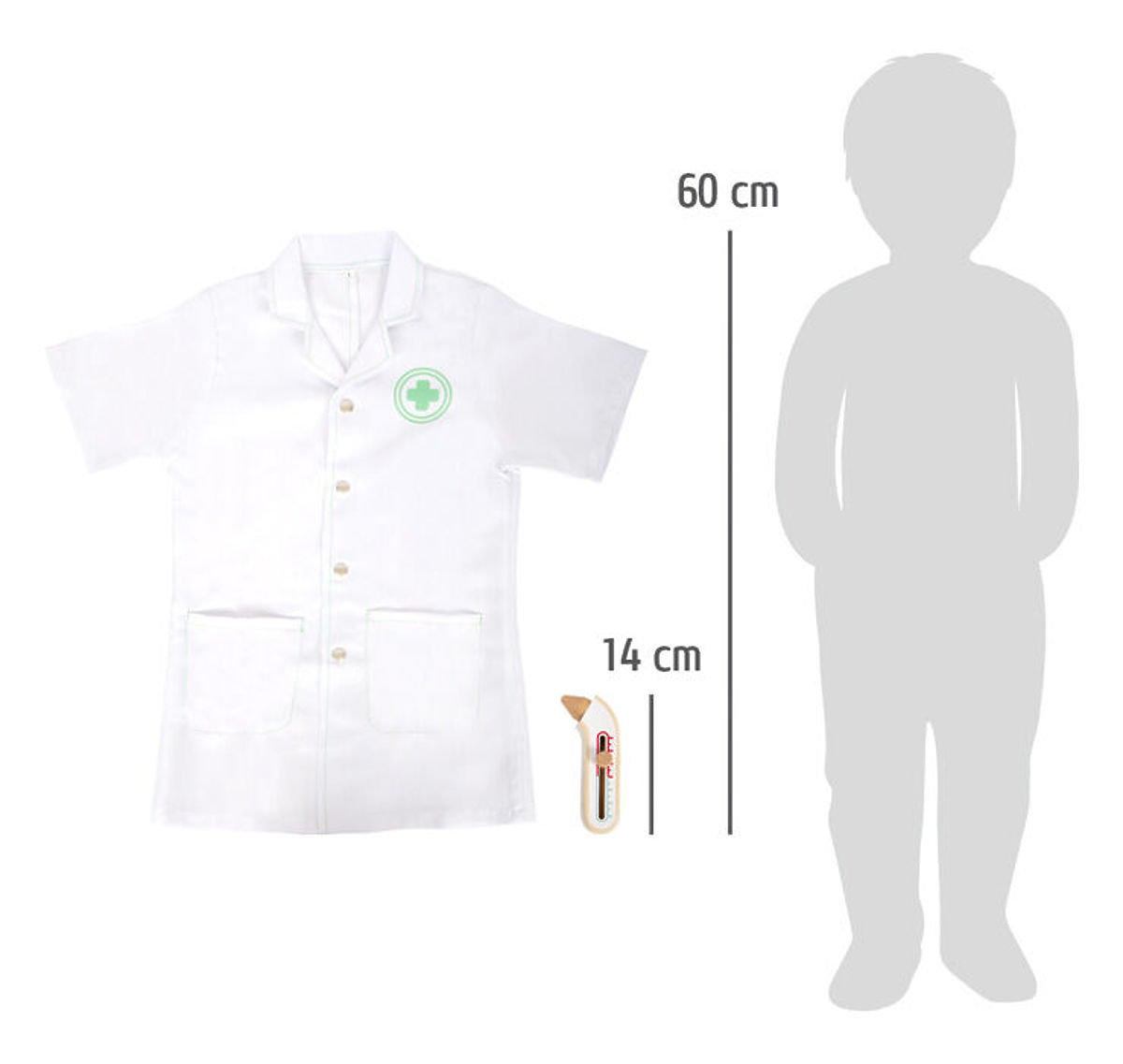 Complete play set with a doctor's coat and medical equipment. It includes a syringe, stethoscope, and thermometer made of sturdy wood. The syringe plunger retracts when pressed. The thermometer has an adjustable temperature indicator. The doctor's coat features two practical pockets and fastens with snap buttons, allowing young medics to quickly put it on and take it off. A perfect toy for role-playing or as a carnival costume. Suitable for children who are 105-110 cm tall (size 110). An ideal accessory for a doctor's bag and other similar products. Main features: doctor's coat and additional accessories for children 105-110 cm tall, perfect for role-playing or carnival.