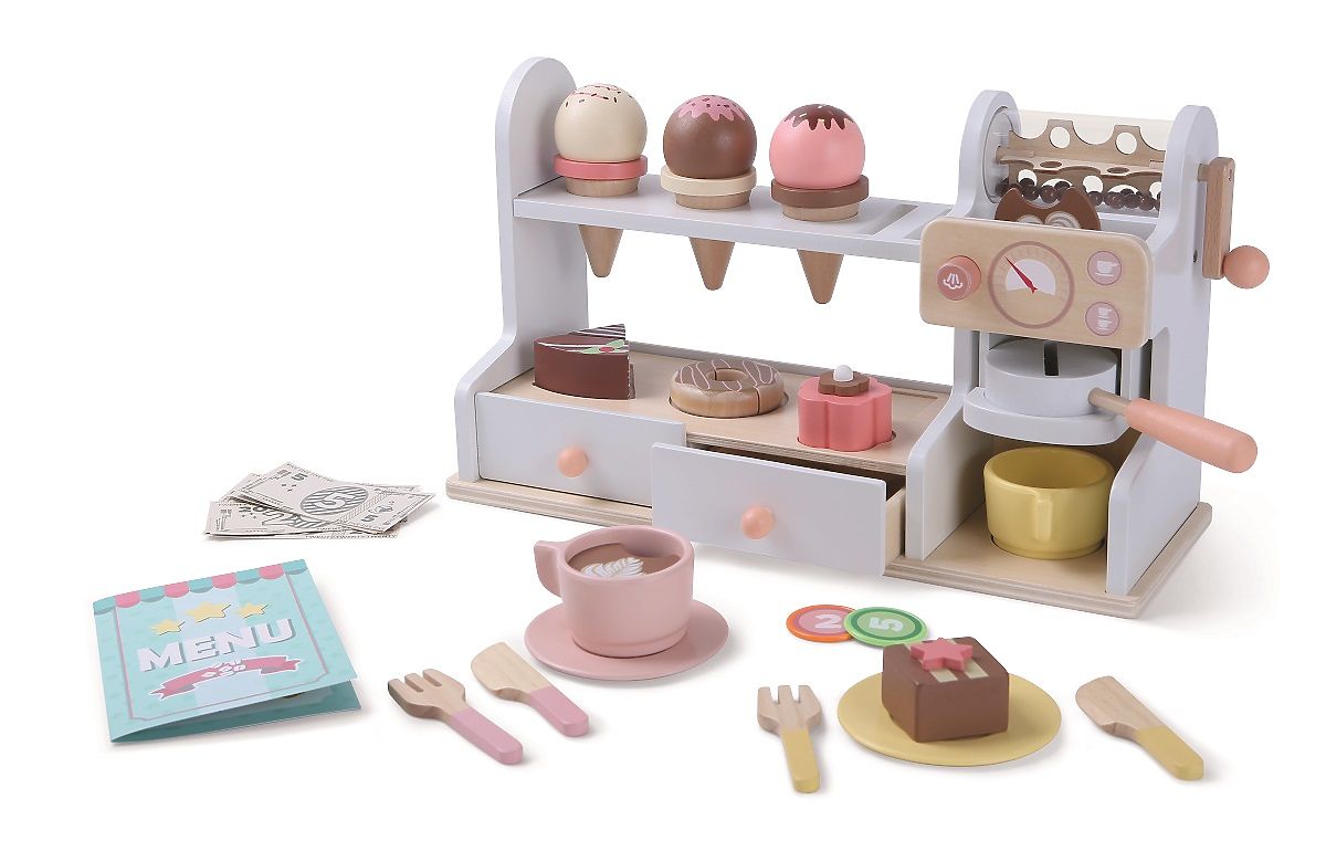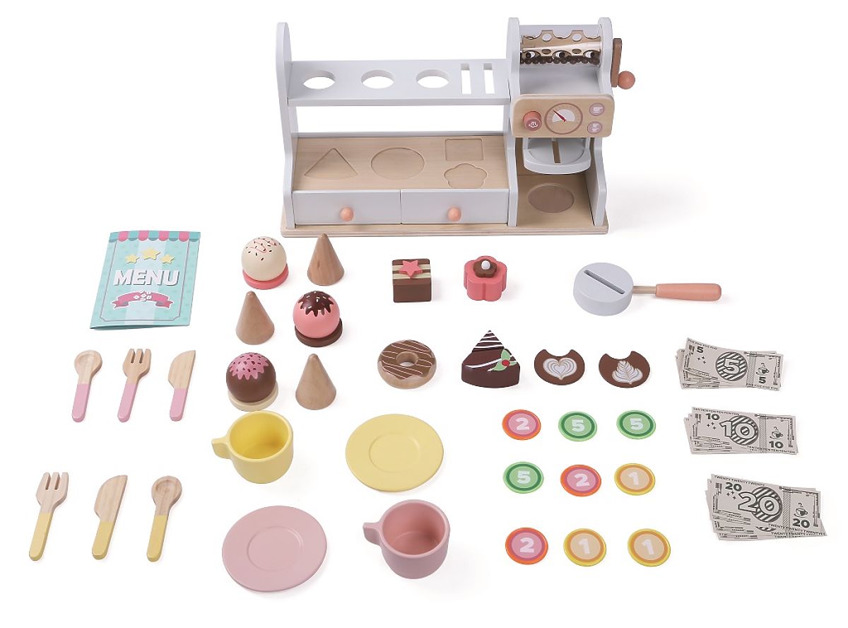 Become a real barista or shopkeeper! Fancy some ice cream, a cake, or just a delicious coffee? With this 46-piece set, you'll enjoy hours of fun. The set offers cups with saucers, cutlery and spoons, a counter with a coffee machine, a display case with cakes, and a shelf with holes for ice creams. There are also drawers with storage space for money, which are also part of this set. Role-playing toys spark children's imagination and inspire creative play, which also positively impacts their vocabulary and language development. Main features: contains 46 pieces, supports language and vocabulary development