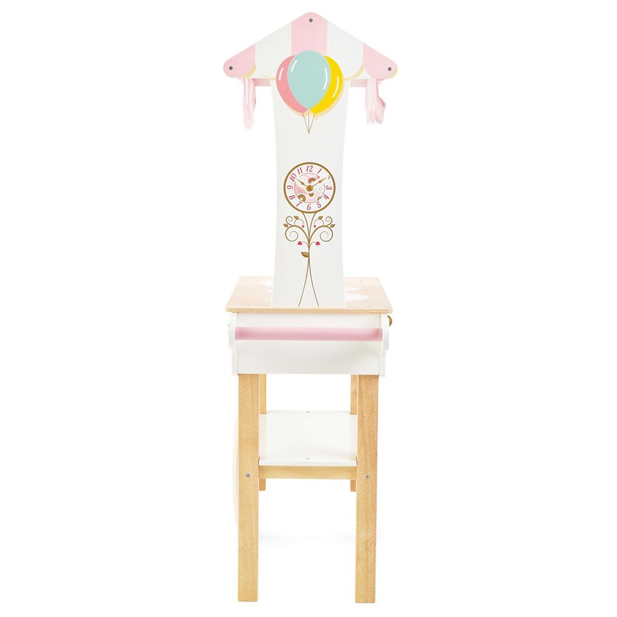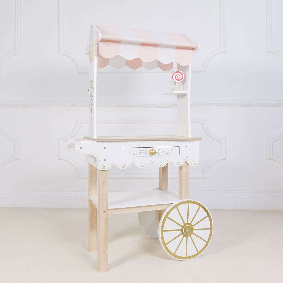 It's tea time! This tea trolley catches the eye at first glance. It features a beautiful vintage design, a colorful canopy, and golden details. The trolley has a secret drawer where children can store money from selling treats. It includes two wheels and a handle for easy movement, as well as colorful illustrations and a chalk menu board. Non-toxic water-based paints are used. Made from natural rubberwood. Purposeful toys All Le Toy Van toys are made with the aim of lasting a long time. Lovingly designed by experienced craftsmen using ethical practices and sustainable materials that are kinder to our planet. Main features: ethically made from sustainable wood tested to the strictest standards painted with non-toxic water-based paints inspires imaginative play suitable for role play the toy has won awards Toy Awards: Good Toy Guide Recommended Honeybake Collection: Toys in this collection are suitable for exploration, helping children develop imagination, social and verbal skills, and cognitive functions. The traditional design with modern details will surely entertain children. Honeybake is Le Toy Van's most awarded collection for design, quality, safety, and educational and play value.