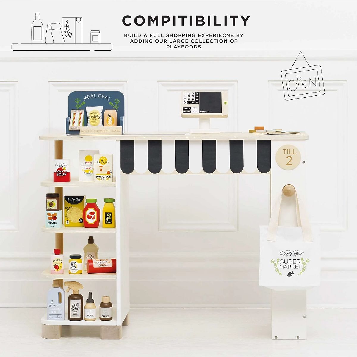 This market stall has everything you could wish for to create the perfect shopping experience in the comfort of your home. It includes a shelf to place various groceries. Delivered with a complete set of realistic foods including, for example, a refreshing can of drink, a bag of chips, ketchup, mustard, pasta... promising an authentic shopping experience for all who love to shop. To make the experience even more interesting, there is also an elegant cash register, a writing board, a conveyor belt, a scanner, play money, a "next customer" sign, a chalkboard with special offers, a cotton "bag for life," and payment, reward, and loyalty cards. All parts are made from sustainable materials, including FSC-certified wood and natural cotton. The set is 100% plastic-free. Purposeful Toys All Le Toy Van toys are made with a purpose – to last long. Designed with love by experienced craftsmen using ethical practices and sustainable materials that are kinder to our planet. Main features: multifunctional, diverse use develops children's communication and social skills made from FSC® certified wood includes rich accessories 100% plastic-free The FSC® (Forest Stewardship Council) brand and certificate guarantee that the wood from which the product was made was not illegally harvested and comes from forests managed in an environmentally friendly or nature-friendly way, where strict environmental and social requirements are met. The FSC® label on the product means that by purchasing it, you are helping to protect forests and support sustainable, responsible, or nature-friendly management, making our forests more stable, healthier, with a natural species composition, and better able to withstand the negative effects of climate change. Honeybake Collection: Toys in this collection are suitable for exploration, helping children develop imagination, social and verbal skills, and cognitive functions. The traditional design with modern details will surely entertain children. Honeybake is Le Toy Van's most award-winning collection for design, quality, safety, and educational and play value.