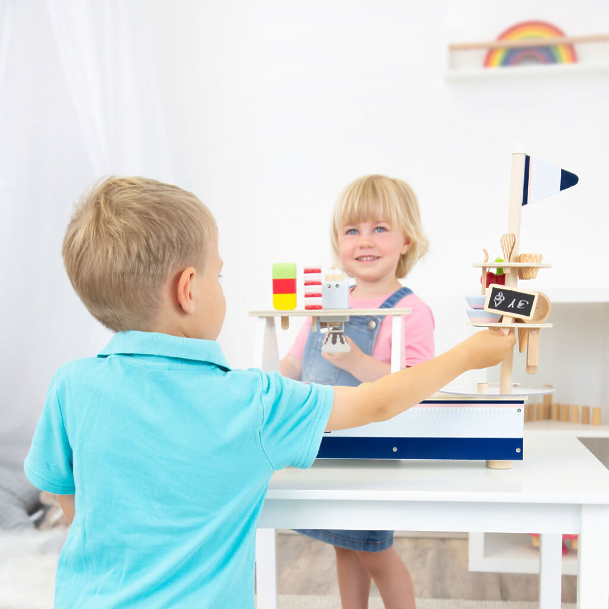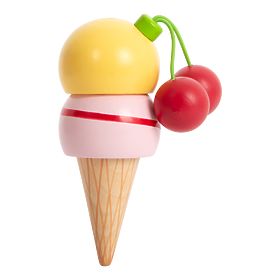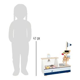 Let's go for ice cream! This wooden ice cream set is perfect for summer and winter. The ice cream stand is blue-pink, it also has elements of natural wood, it will delight customers with a large selection of desserts and its functions and accessories. You can have multiple scoops of ice cream, popsicles, sundaes, sundaes, waffles... and garnish it all with a cherry. The stand also has a plastic showcase, a freezer with a plastic lid, and a stand for cones. The ice cream scoops and ice cream cones are magnetic, and the package also includes a chalkboard that you can write on. You can take the ice cream (vanilla, chocolate, stracciatella and strawberry) out of the display case and put it in a bowl or cone. They all fit on a waffle too. Create a dessert according to your taste. The ice cream stand also has storage space. Main features Ice cream scoops and ice cream cones with magnets Eight different flavors of ice cream, popsicles Scoops can be stacked on top of each other thanks to magnets Large and small ice cream cones, bowls with spoons, waffles Stand with plastic display case, freezer with transparent lid Gender neutral, delicate design