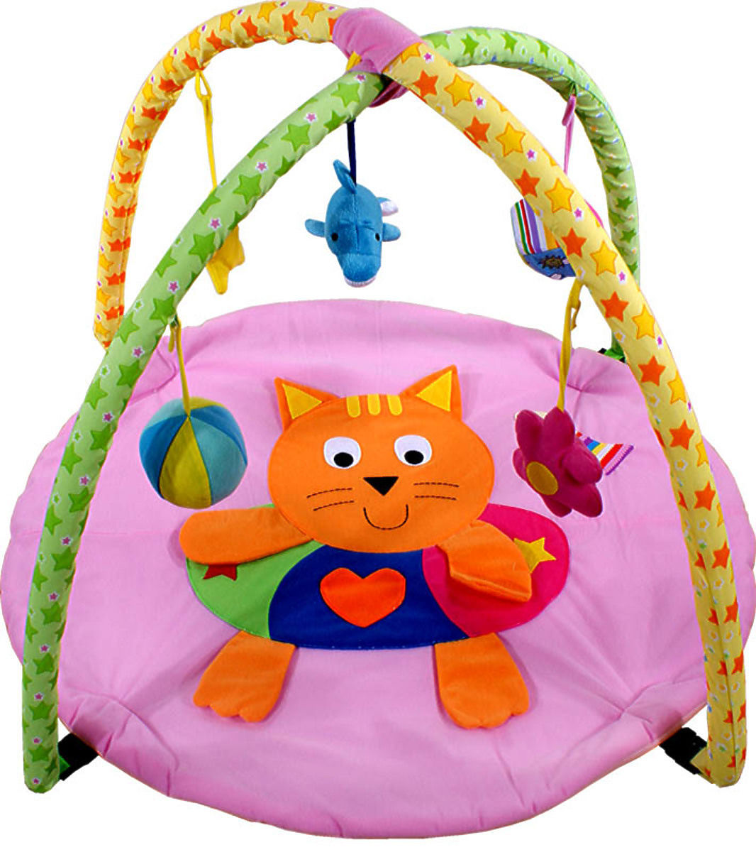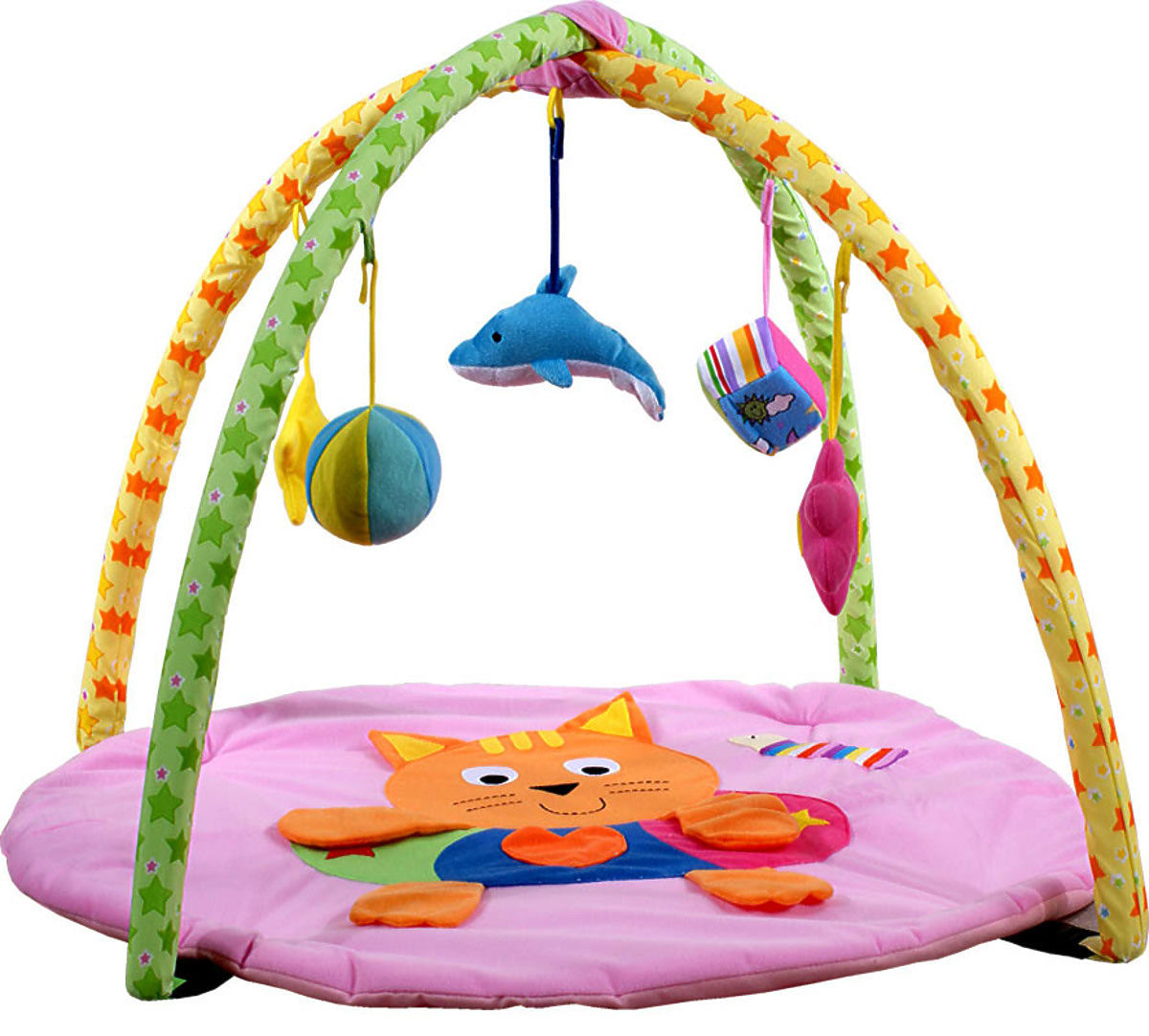 Get this pink educational gym with a kitten for your baby. It contains several colourful ball and cube-shaped rattles.