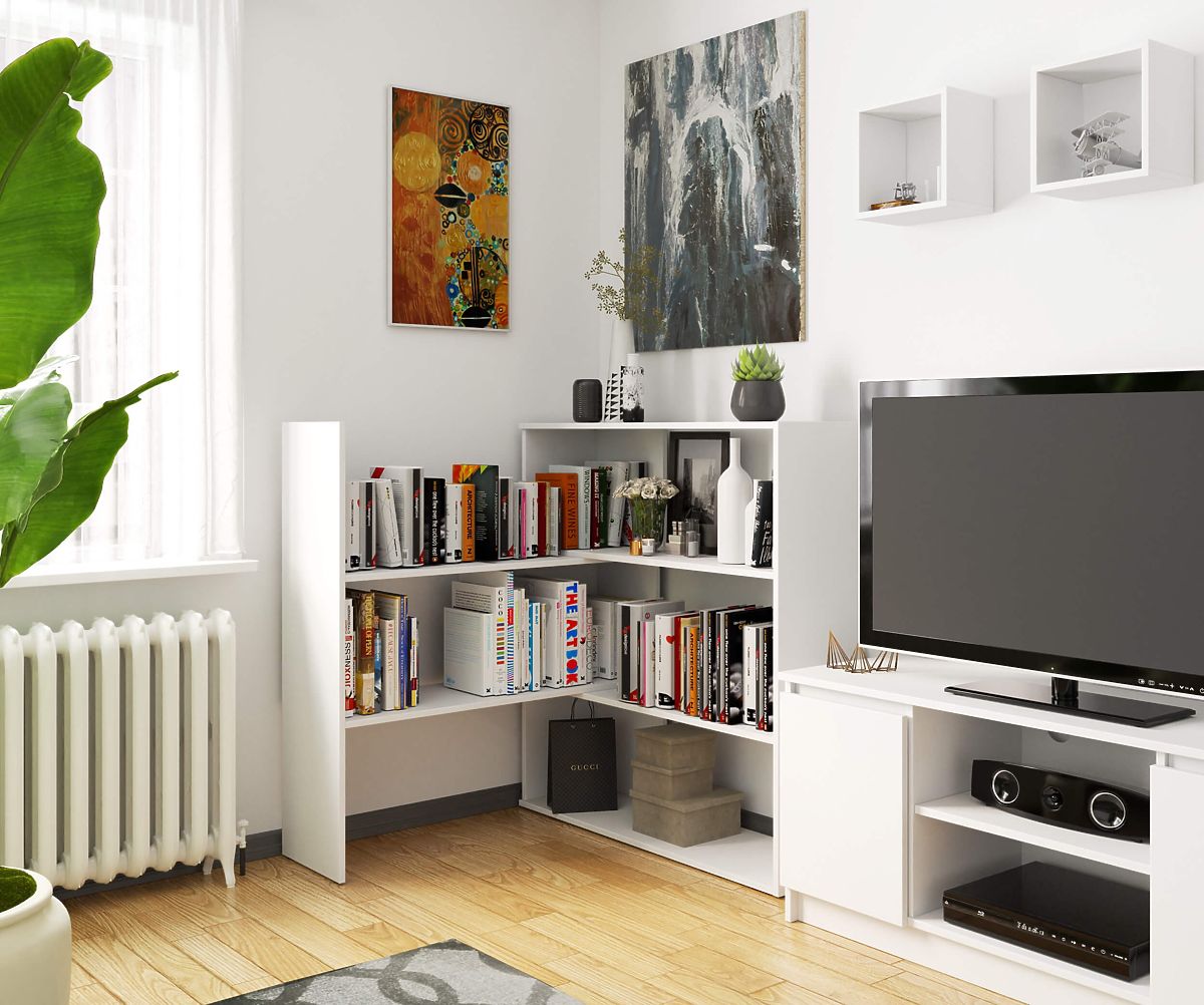 The unique adjustable Mini TWIST shelf can be unfolded or turned into a corner shelf. Thanks to its features, it is ideally suited for any type of living room, office, or children's room.