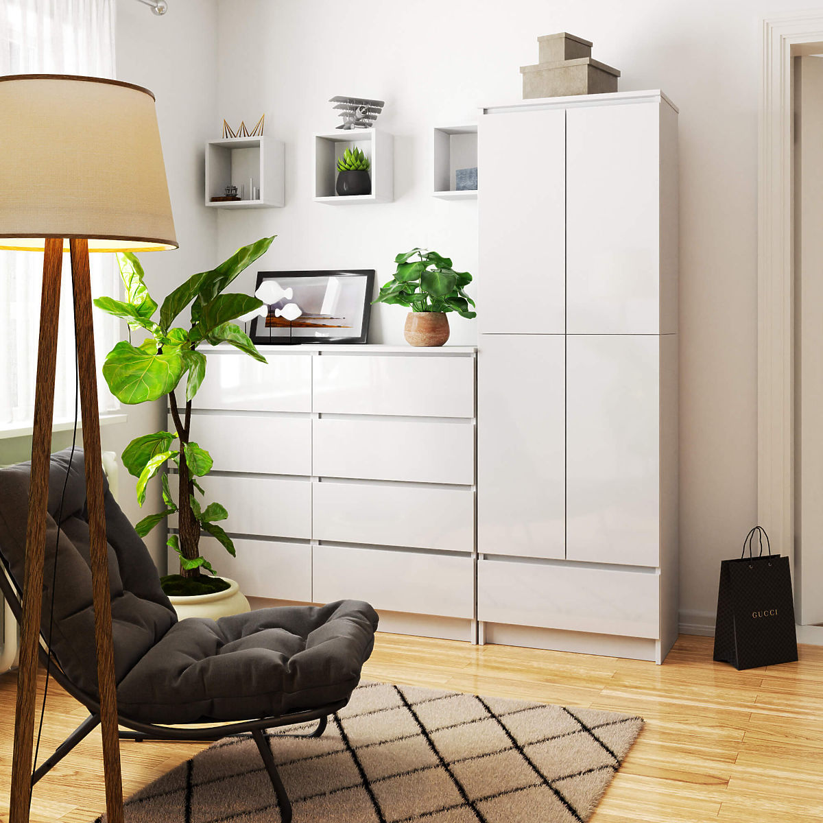 The white office bookcase with a drawer is a perfect combination of functionality and visual appeal. The furniture is practical and easy to maintain in perfect cleanliness, while also being very impressive. The closed section contains spacious shelves, while the bottom part has a roomy and easy-to-slide drawer. The use of the bookcase is very versatile and depends on individual needs. The cabinet can store books, document binders, and office supplies, as well as be used for tableware, tablecloths, or towels. The classic white color and simple shape of the bookcase ensure that the furniture fits into any interior, regardless of wall color or style. The furniture is made from durable material, which is wear and damage-resistant laminated board. The edges of the cabinet are covered with durable and aesthetic ABS edging. The fronts of the bookcase are lacquered to a high gloss, adding extra elegance to the furniture. The top and bottom doors are combined into one unit and are not opened separately.