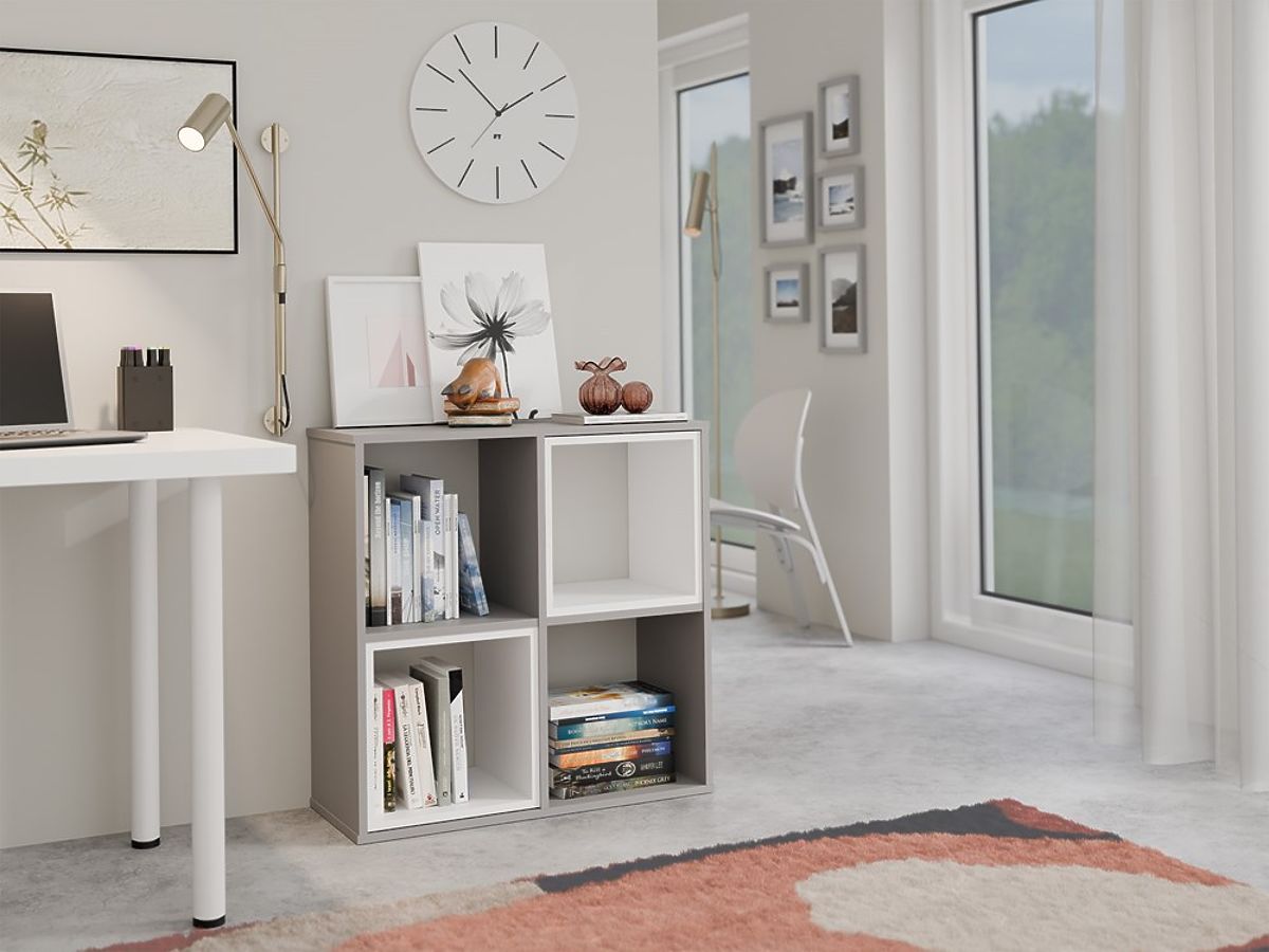 Functional gray shelf with 4 compartments for books and documents. .. more