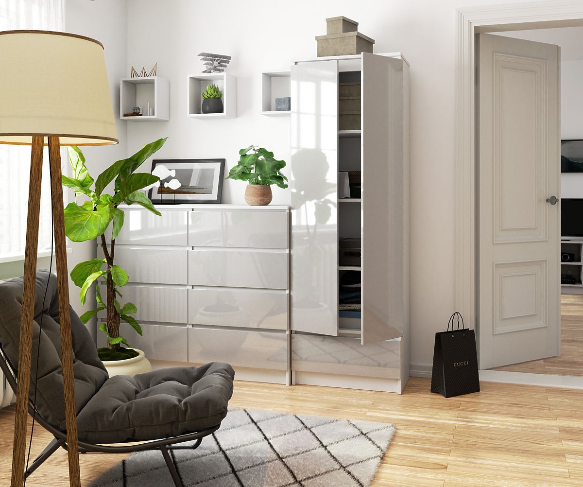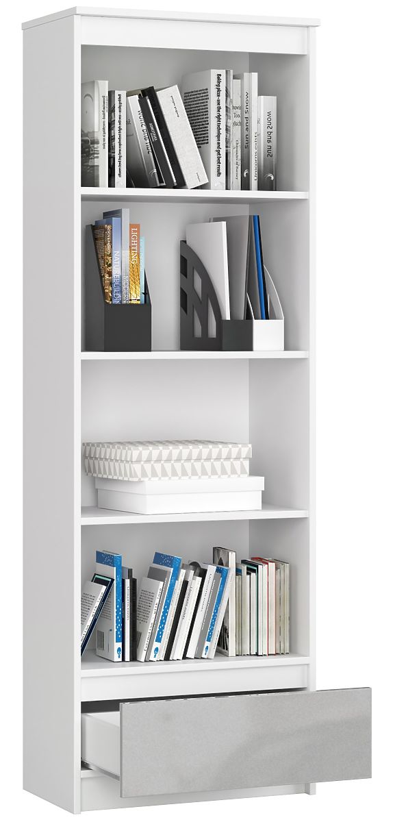 The shelf is a piece of furniture that finds application in every household. It can be used for storing books, folders and binders with documents, photo albums, but also frames, souvenirs, or many other items. It is most often seen in a youth room, living room, or home office, but it is also perfect for office spaces. The presented shelf is a combination of good price, functionality, quality, and design. It deserves recognition due to the combination of two most fashionable and timeless colors - white and gray. The shelf consists of four large shelves and a spacious drawer. The cabinet is very stable, characterized by a solid construction and attention to detail. It is made of laminated board with above-average durability and abrasion resistance. The front sides are designed in a glossy gray color, giving the whole a unique character. We also invite you to explore other office furniture elements from this collection.