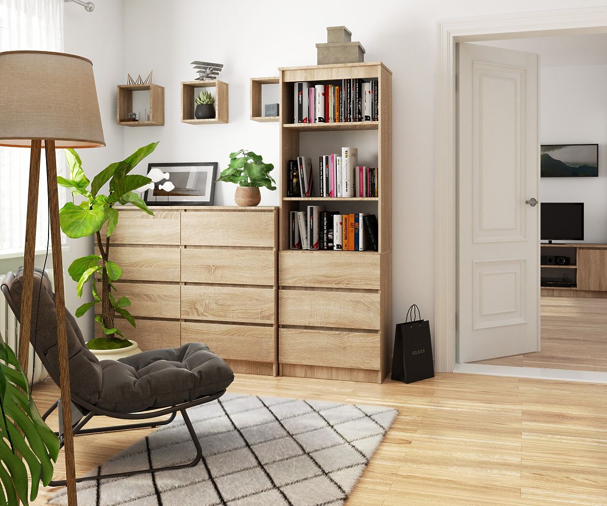 The CLP office shelf is practical and versatile furniture suitable for both office and home. Maintained in a classic oak sonoma shade, it perfectly matches other furniture in this color, allowing for very effective arrangements. The shelf is made from 16mm thick laminated board. It is a durable and resistant material characterized by high abrasion resistance. The edges are additionally protected with an ABS edge, so the furniture will still look good even with very intensive daily use. The shelf is equipped with two shelves for displaying or keeping items handy. Three deep drawers are perfect for storing less representative items and small things. The whole piece looks very stylish and modern. Its universal style allows for easy integration into interiors with different purposes, furnished in various styles.