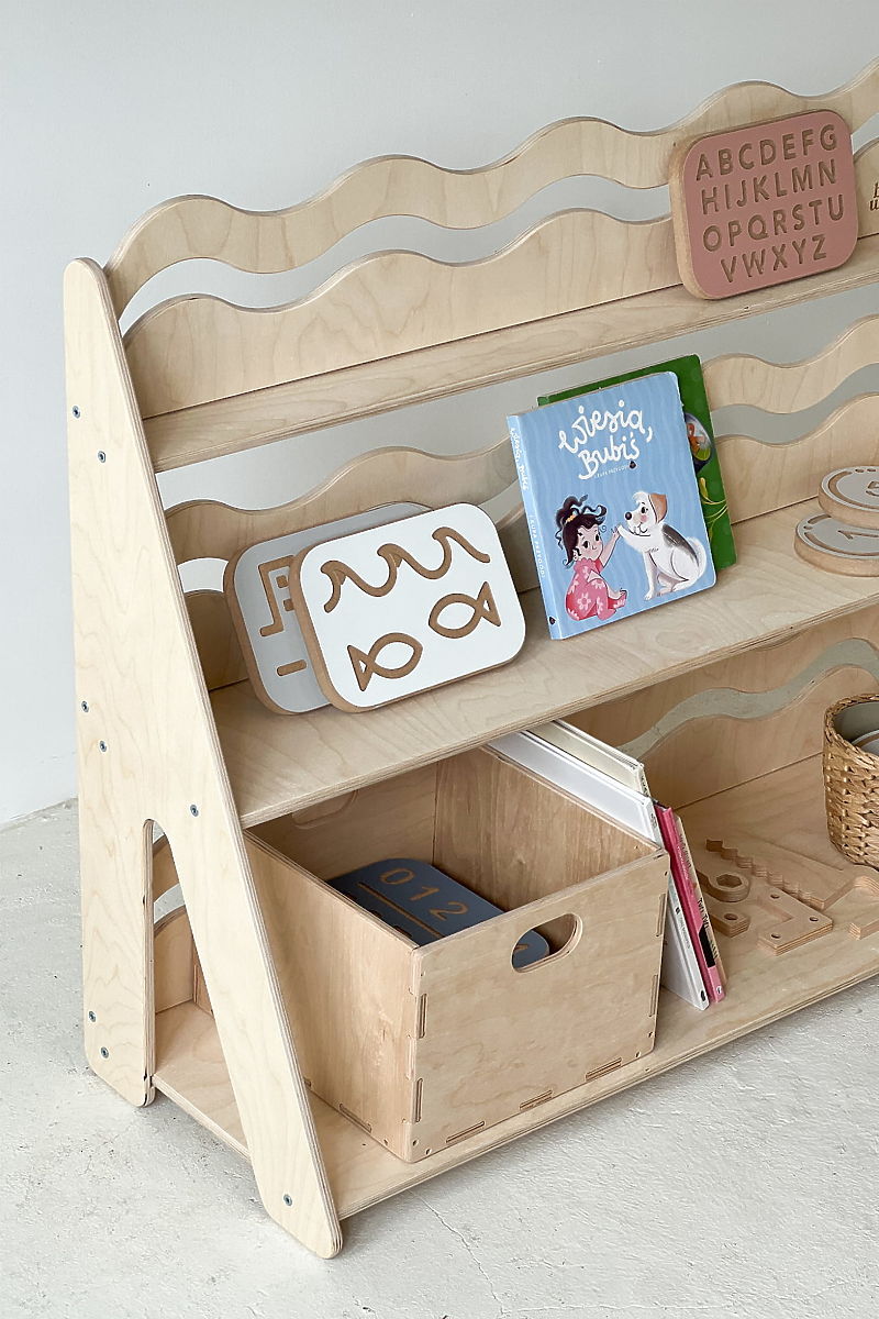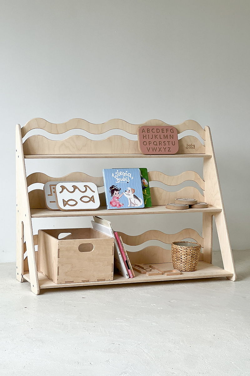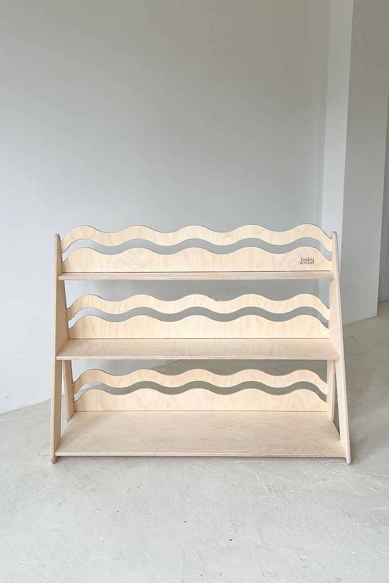 Natural WAVE L shelf with wavy slats for books and toys. .. more