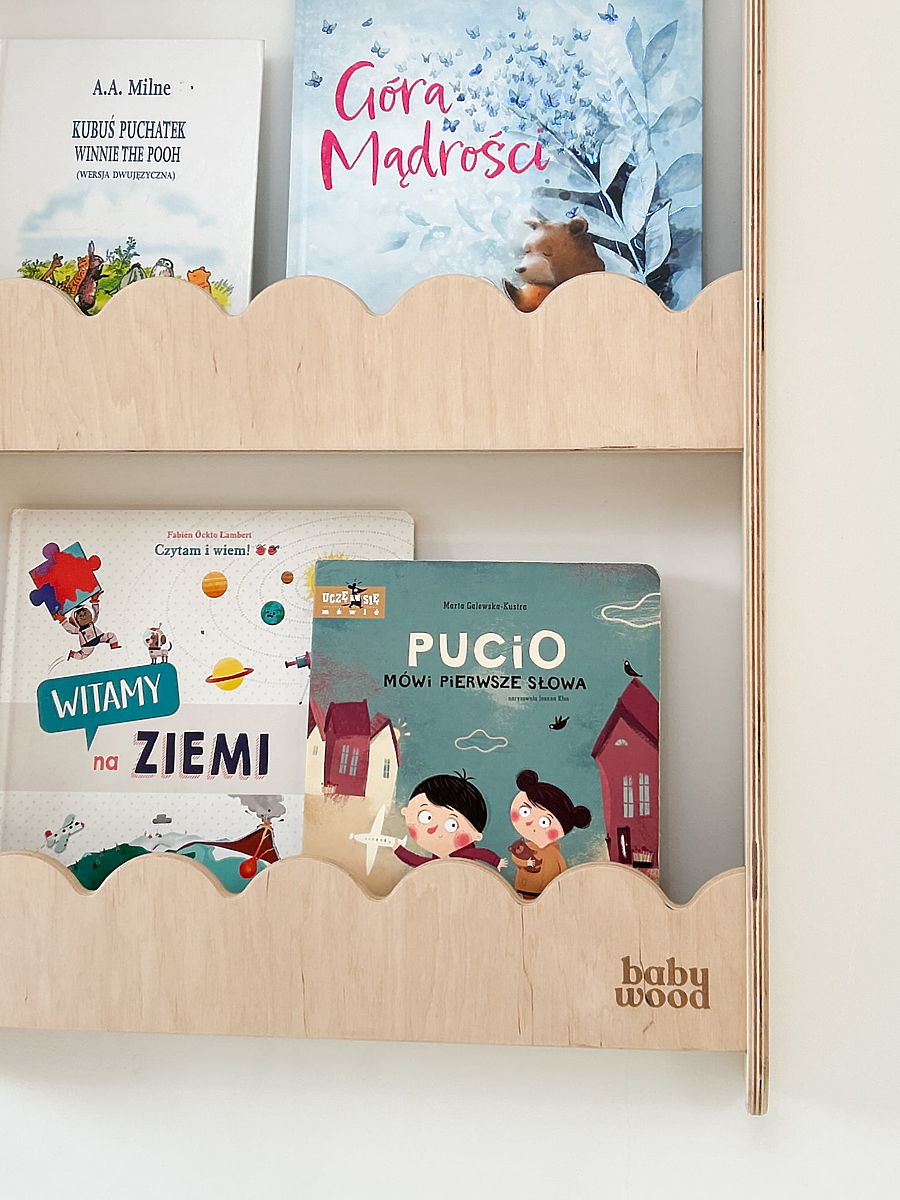 Wall-mounted natural shelf for books and toys, saving floor space. .. more