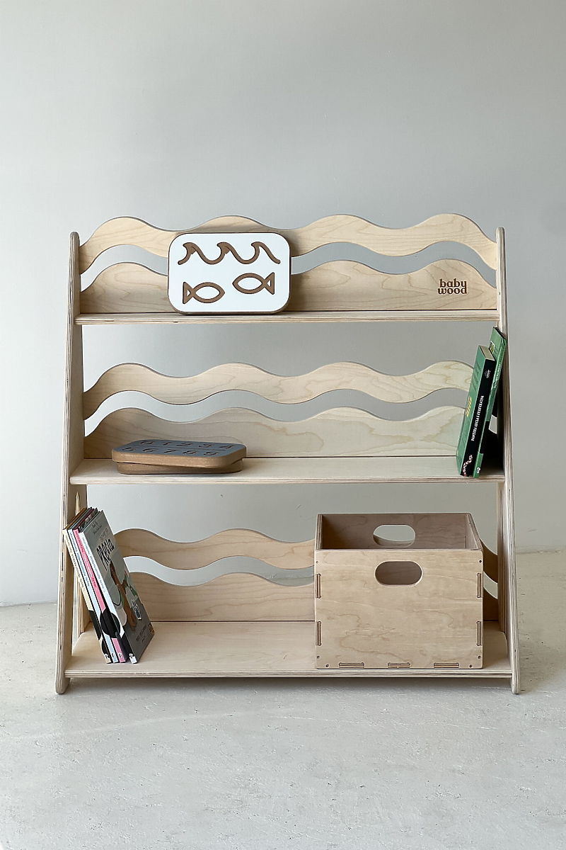 The WAVE M wall shelf in natural color is a practical and decorative bookshelf for a child's room, designed in the Montessori spirit. It helps the child maintain order while promoting independence – everything the child needs is easily accessible without adult assistance. Three open shelves allow for storing books, toys, and all of the child's small treasures. Wavy front slats add lightness to the shelf and visually soften the simple form. Natural materials and safe craftsmanship ensure stability and longevity, while providing children with a safe and organized space for play.