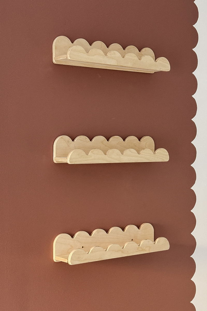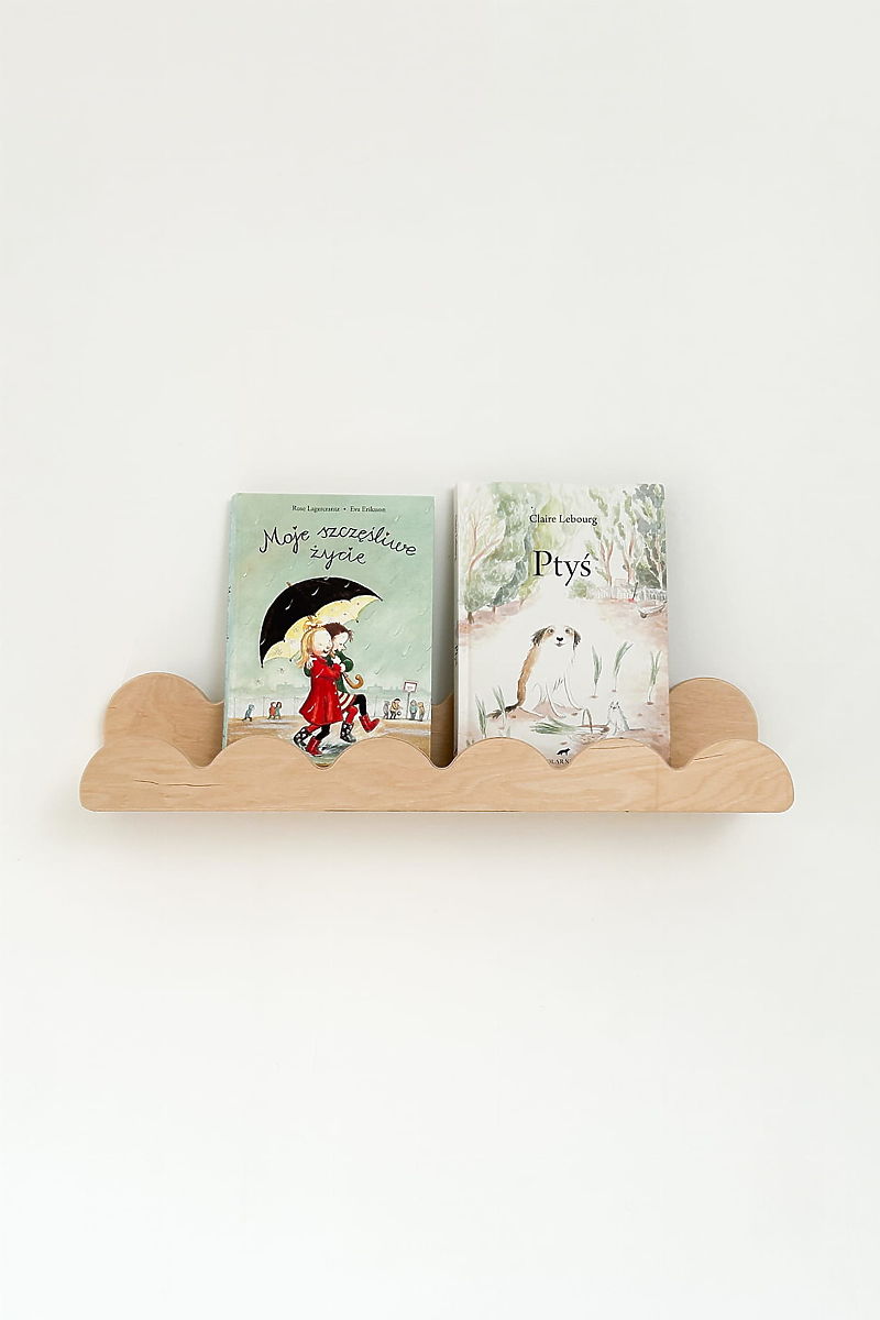 WAVE Shelf in natural color is a practical and decorative addition to a child's room, helping to maintain order while adding a pleasant, natural accent. Thanks to the movable ruffle, you can easily change its appearance and display or hide your child's favorite small items – books, figurines, photos, or small decorations. The shelf's design allows you to combine several pieces side by side to create an original, functional, and aesthetic wall that grows with the child's needs. Rounded edges and smooth finish ensure safe use even for the youngest.