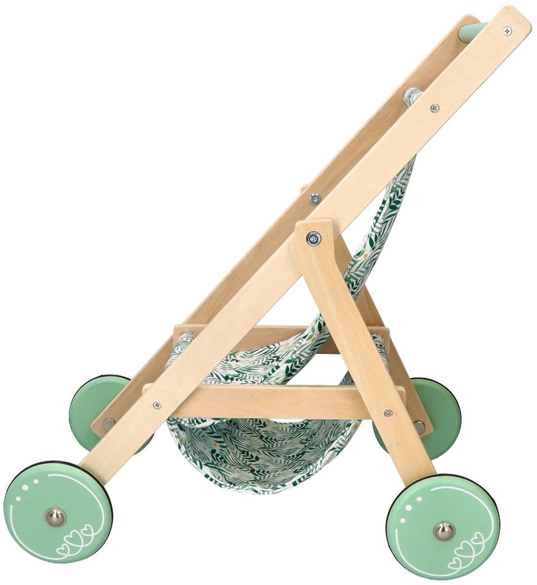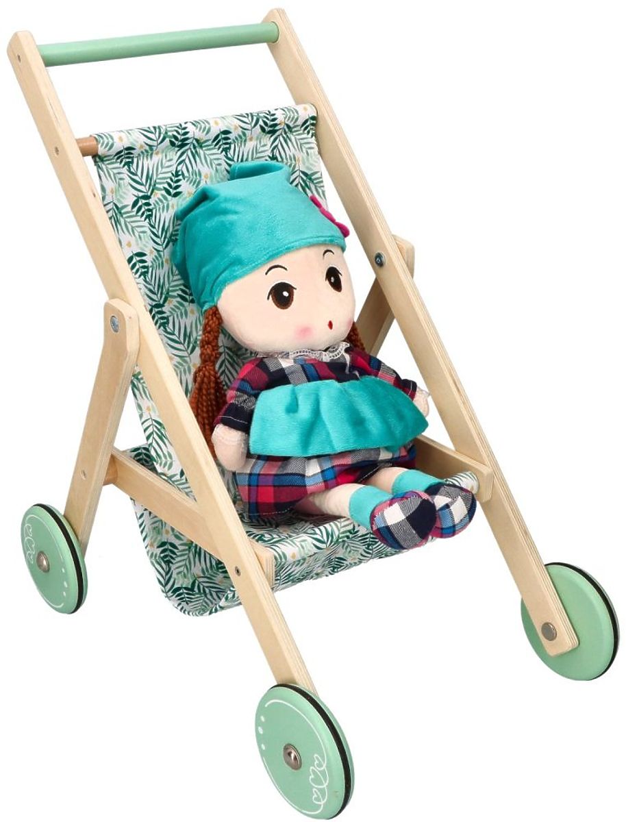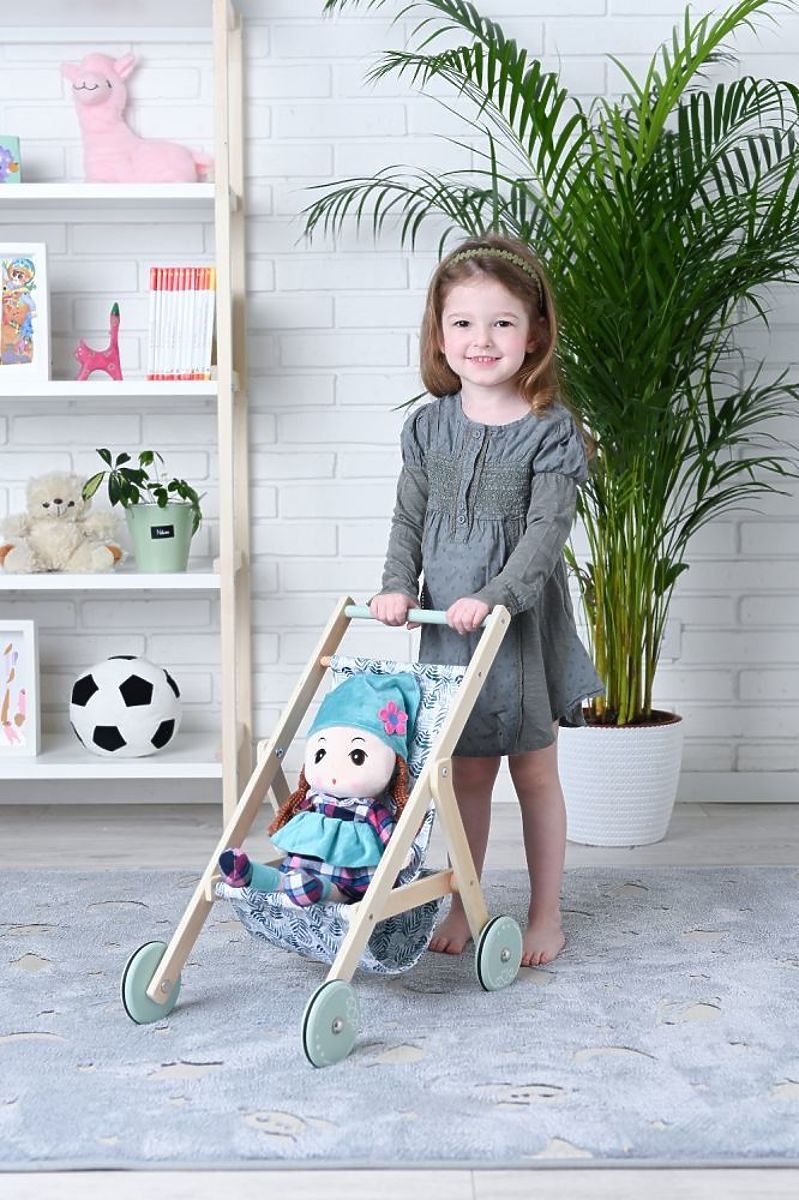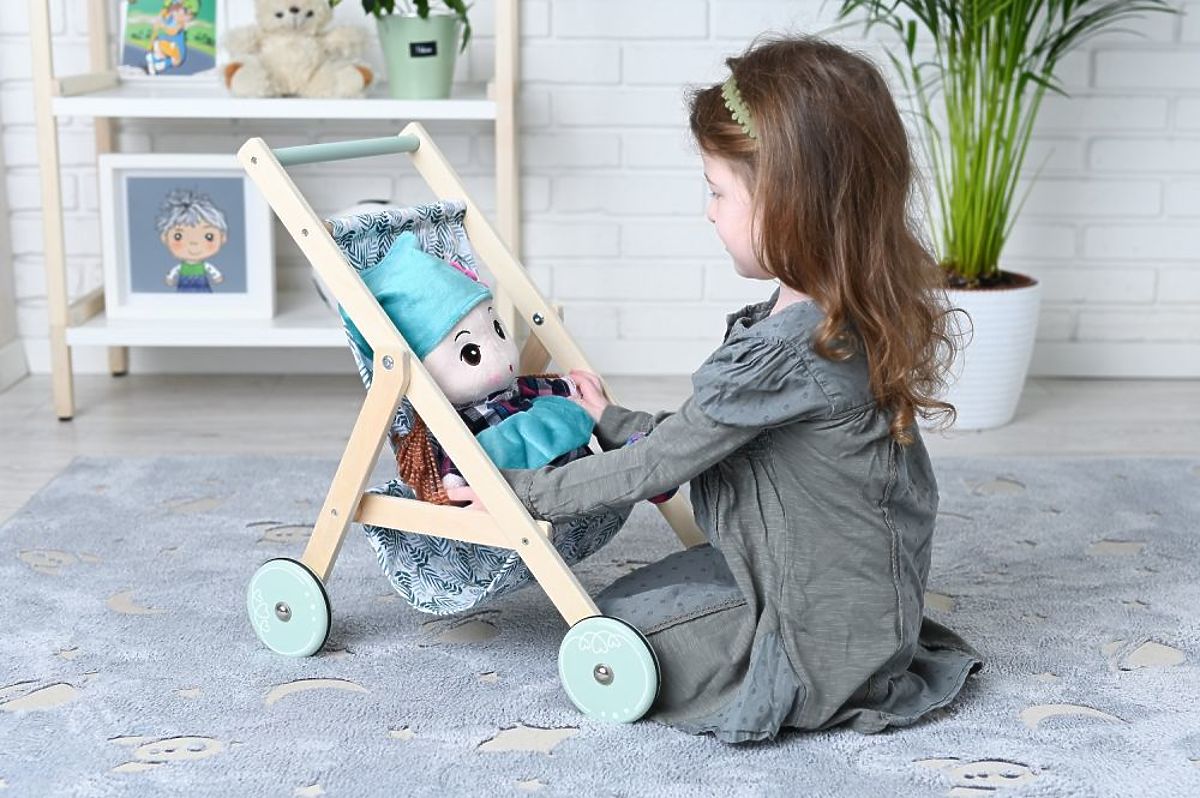 The light wooden doll stroller is a new design from AdamToys for a child's summer walks with their favorite dolls. From now on, walks will become an extraordinary attraction thanks to the stroller's cute appearance and lightweight construction. The stroller pushes very smoothly due to its large wheels with rubber anti-slip strips and low weight. It is made of wood with mint accents on the wheels and handle. A doll or teddy bear can be seated on the seat with beautiful green branches. The overall look is very charming and will surely catch many eyes on the promenade and playground.