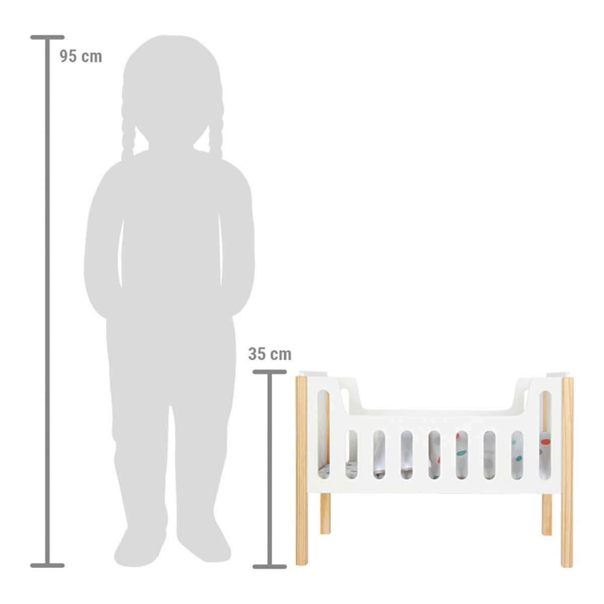 This modern wooden doll bed in a Scandinavian linear design is the perfect bed for tucking in dolls or plush toys. It features high-quality craftsmanship with rounded edges and visible solid wood elements. Included is a reversible bedding set with a large blanket, allowing for comfortable sleeping for larger dolls or plush toys up to 46 cm in size. The raised sleeping area for dolls enables ergonomic play. With its subtle design in neutral white combined with natural wood, this stable bed fits perfectly into any living room or children's room interior. Main features: "Little Button" doll furniture series, reversible bedding, suitable for dolls up to 46 cm.