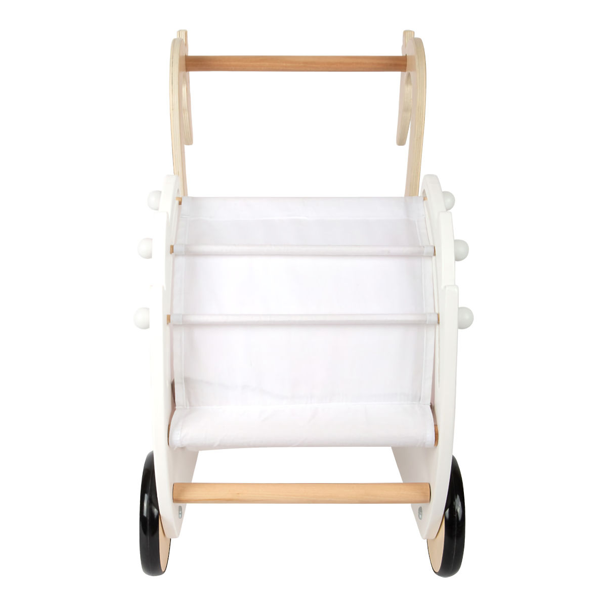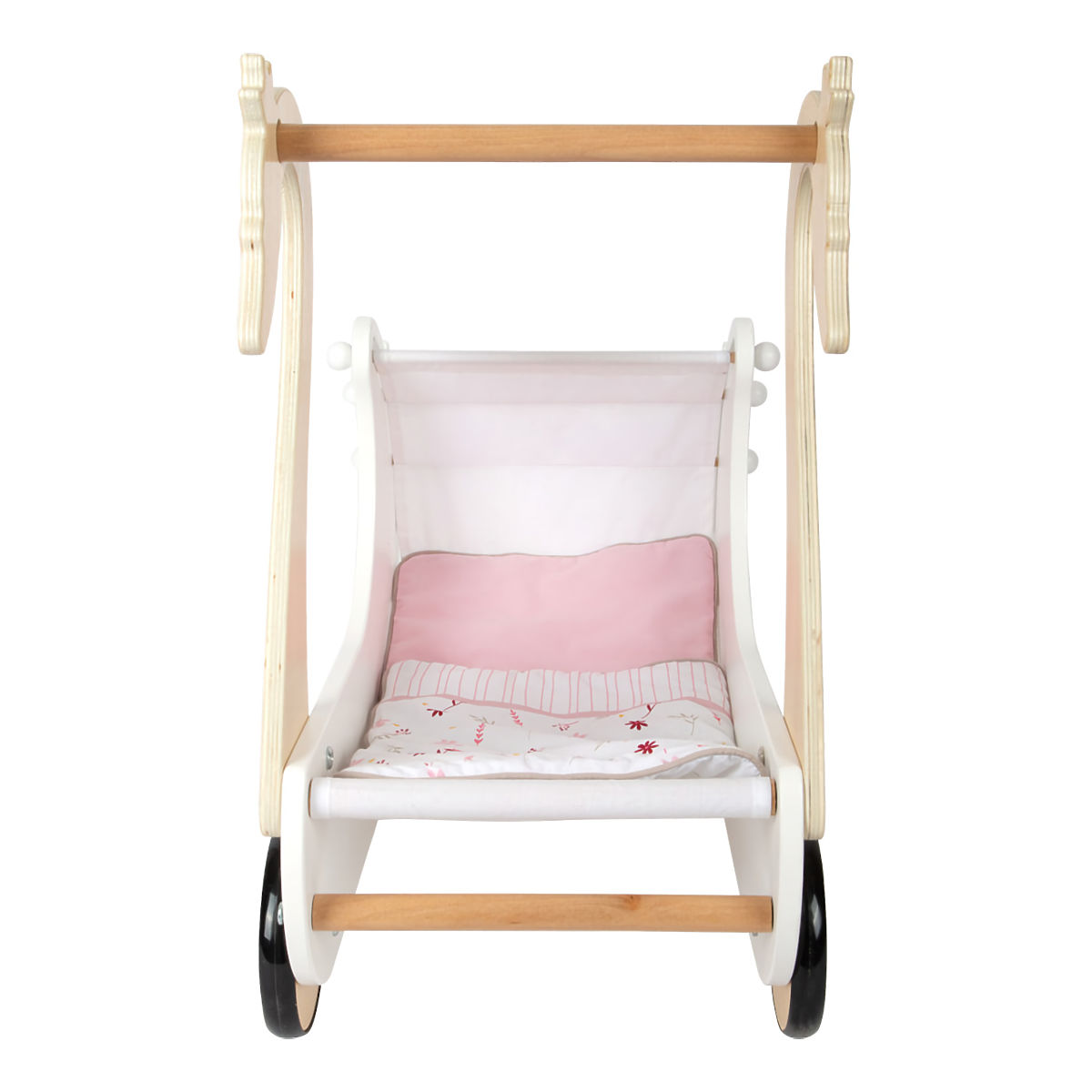 Care for dolls with swan elegance! Let children develop imagination and social skills. With its refined colors and simple shapes, the stroller playfully complements any girl's room. It accommodates even oversized dolls, is equipped with a retractable fabric canopy, and comes with floral pink and white bedding. Rubberized wheels offer smooth and quiet operation on all types of surfaces and protect them. The construction combines durable plywood and particularly pleasant-to-touch solid wood. The product requires assembly and comes with detailed assembly instructions. Main features: stroller including bedding for dolls up to 46 cm in height, retractable canopy, quiet operation, durable wooden design.