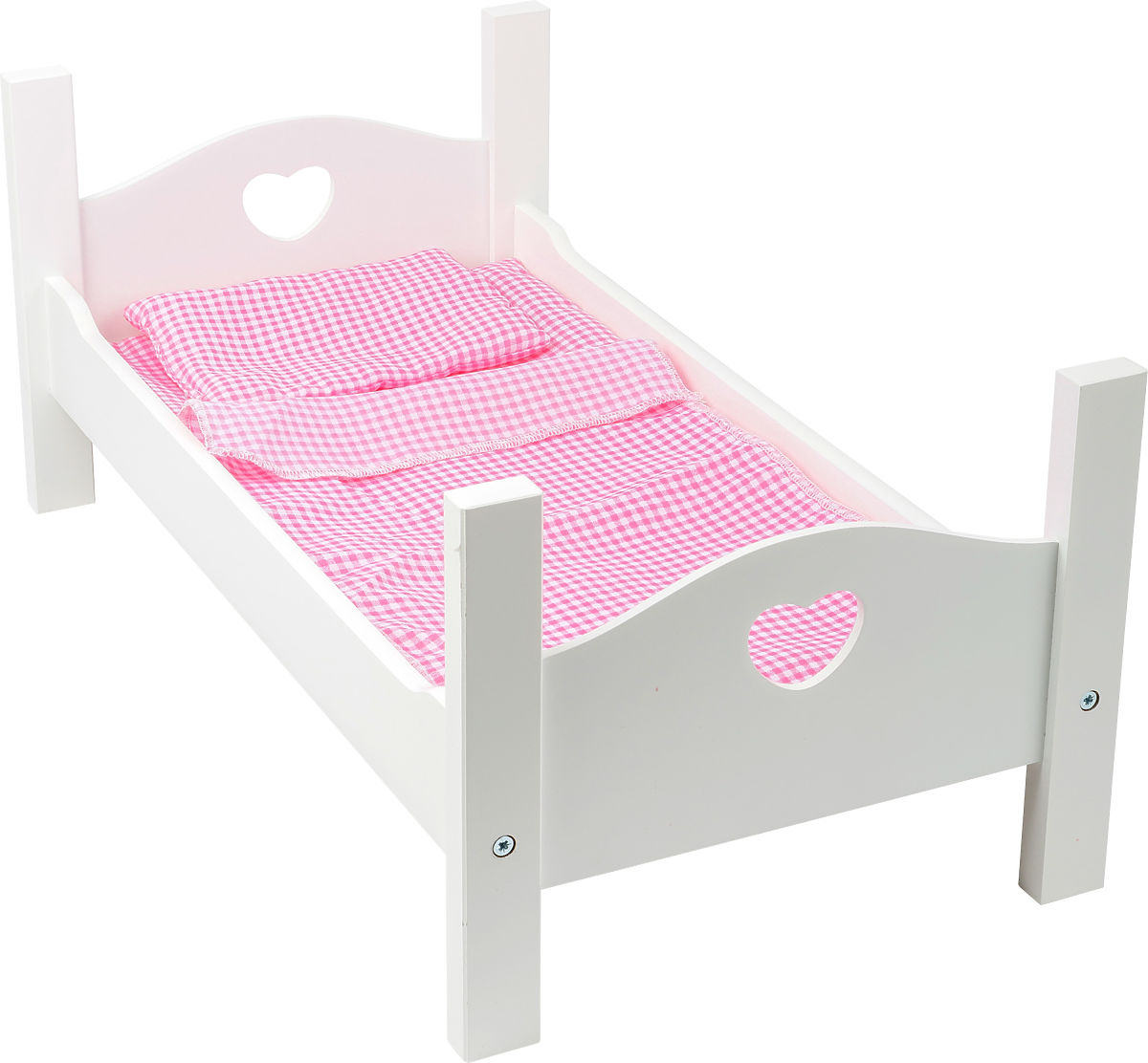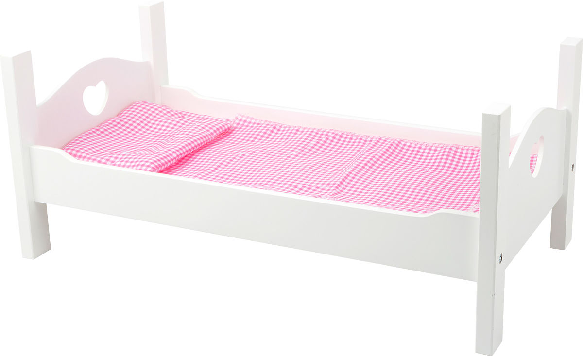 In this cradle, dolls or plush toys will sleep sweetly! A modern wooden cradle in white color with heart details on the headboards. The package includes a pillow, blanket, and sheet. An ideal addition to a doll furniture set. Main features: for dolls up to 45 cm in size, including bedding