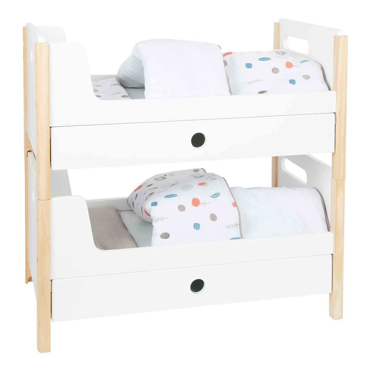Beautiful bunk bed! You'll be thrilled with its functionality and Scandinavian design, which fits nicely into any children's room. It's modern, reversible, features gender-neutral bedding, and oversized duvets where dolls and plush toys up to 46 cm can sleep comfortably. By stacking the beds into a bunk bed, a ladder is created on one side. The drawers under each bed are perfect for storing doll accessories. High-quality, stable construction, rounded edges, visibly wooden... A perfect toy for every children's room. Main features Can be used as single beds or a bunk bed Drawers for storing doll accessories Gender-neutral bedding Oversized duvets Rounded edges, visibly wooden For dolls and plush toys up to 46 cm Scandinavian linear design Little Button The range of attractive accessories for dolls Little Button offers a wide variety of products, from strollers to high chairs and wardrobes. Customers are easily captivated by the unified functional and subtle design utilizing straight lines and modest neutral colors. This allows them to create cohesive harmonious sets that tastefully complement a modern interior. Ingenious construction and quality workmanship help ensure high stability, safety, and long-lasting durability. With their help, create a stylish corner for dolls where your children can develop their imagination and caregiving skills.