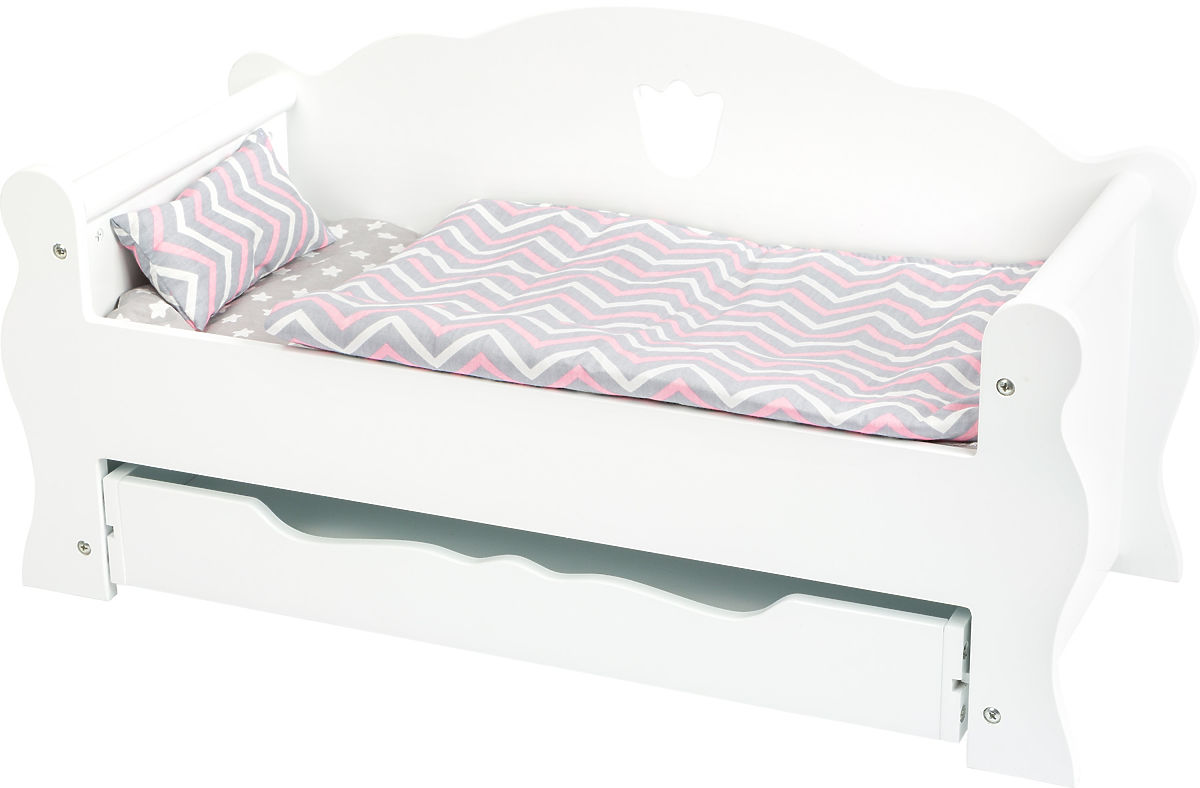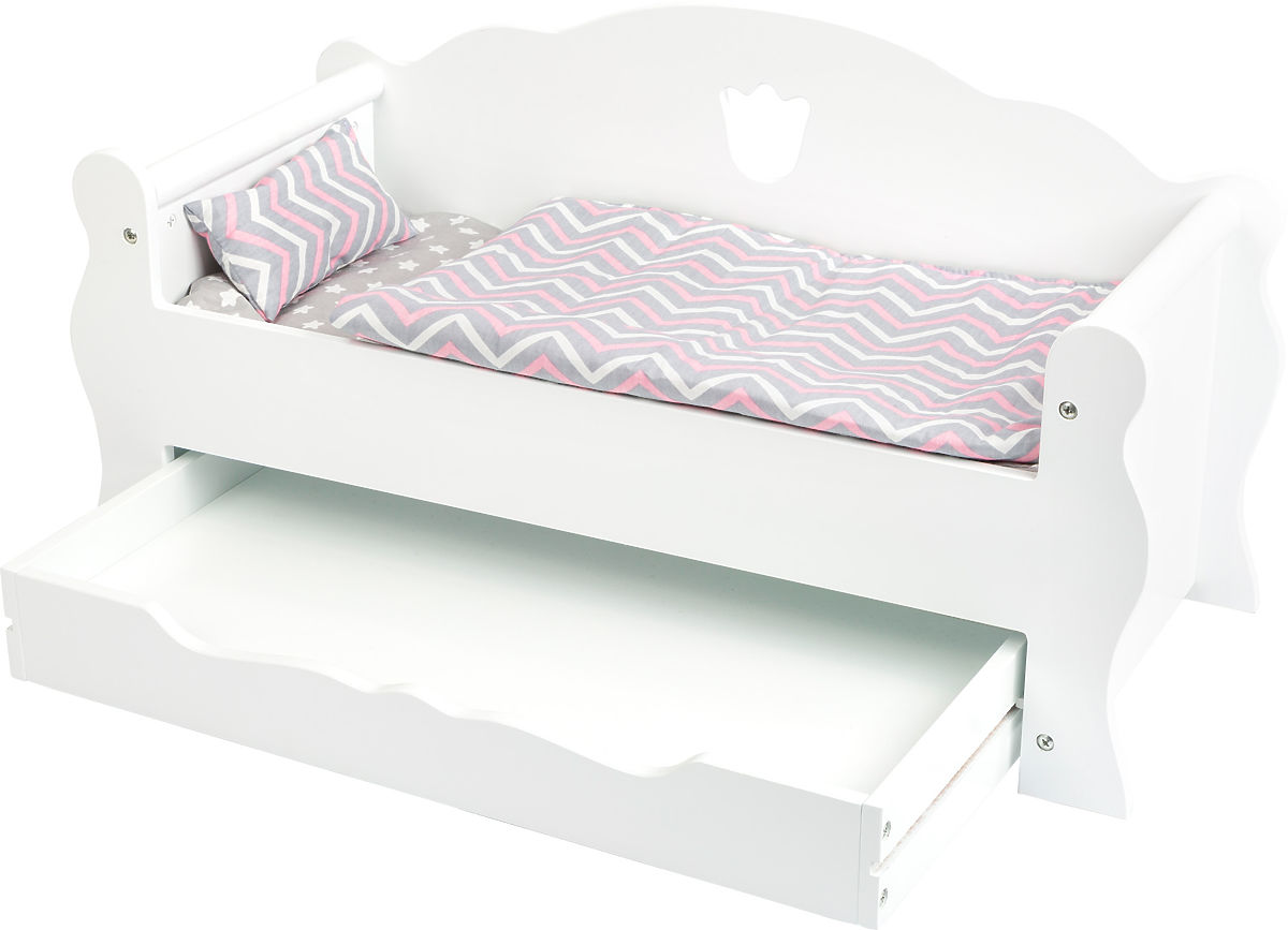 This elegant bed can be quickly transformed into a comfortable sofa, making it useful both day and night. The practical storage space can hide a blanket and pillow or be used as a place for another sleeper. Dolls or plush toys will surely appreciate the opportunity to stretch out and rest after a busy day. Main features: suitable for dolls up to 45 cm, practical pull-out storage space under the bed, includes mattress, blanket, and pillow