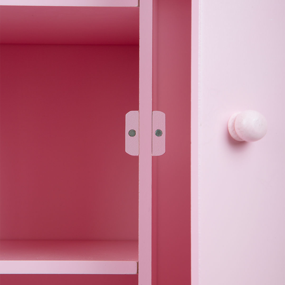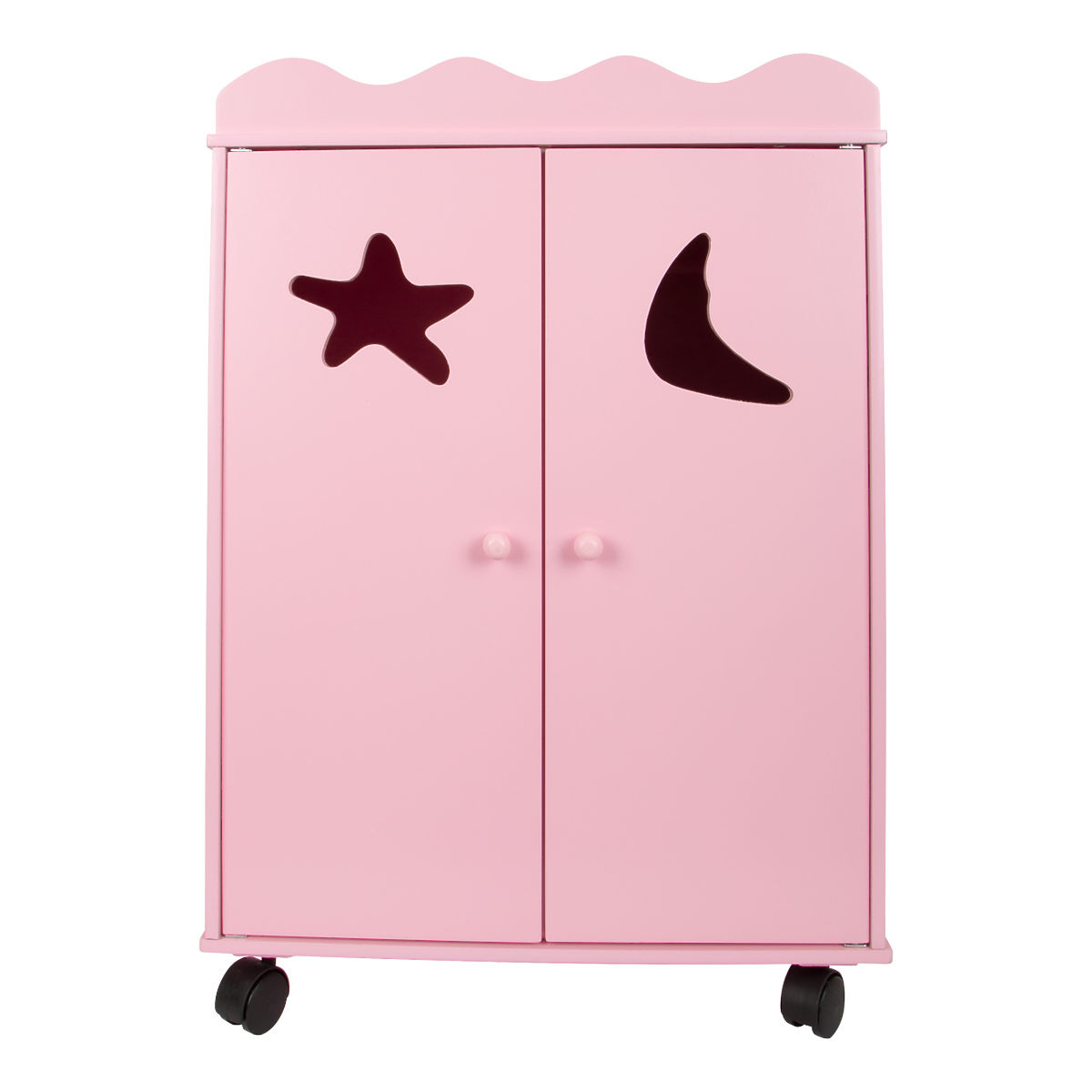 A lacquered cabinet on wheels, offering plenty of space for every piece in your dolls' wardrobe. The left side consists of two shelves, while the right side provides space for hanging clothes. The doors feature two motifs, a star and a moon, which make this cabinet even more adorable! Main features: spacious wooden wardrobe, clothes rail with shelves, doors with magnetic closure