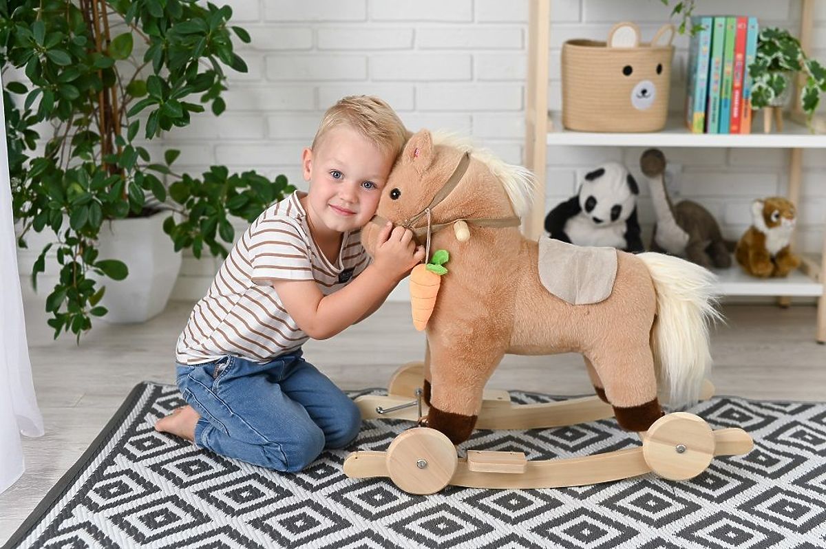 Look at this beautiful horse. What is it running towards? It joyfully gallops and invites you to play together. This is our newest rocking horse – joyful, eager, and full of zest for shared fun. And what does it get in return? Of course, lots of fun and a carrot.