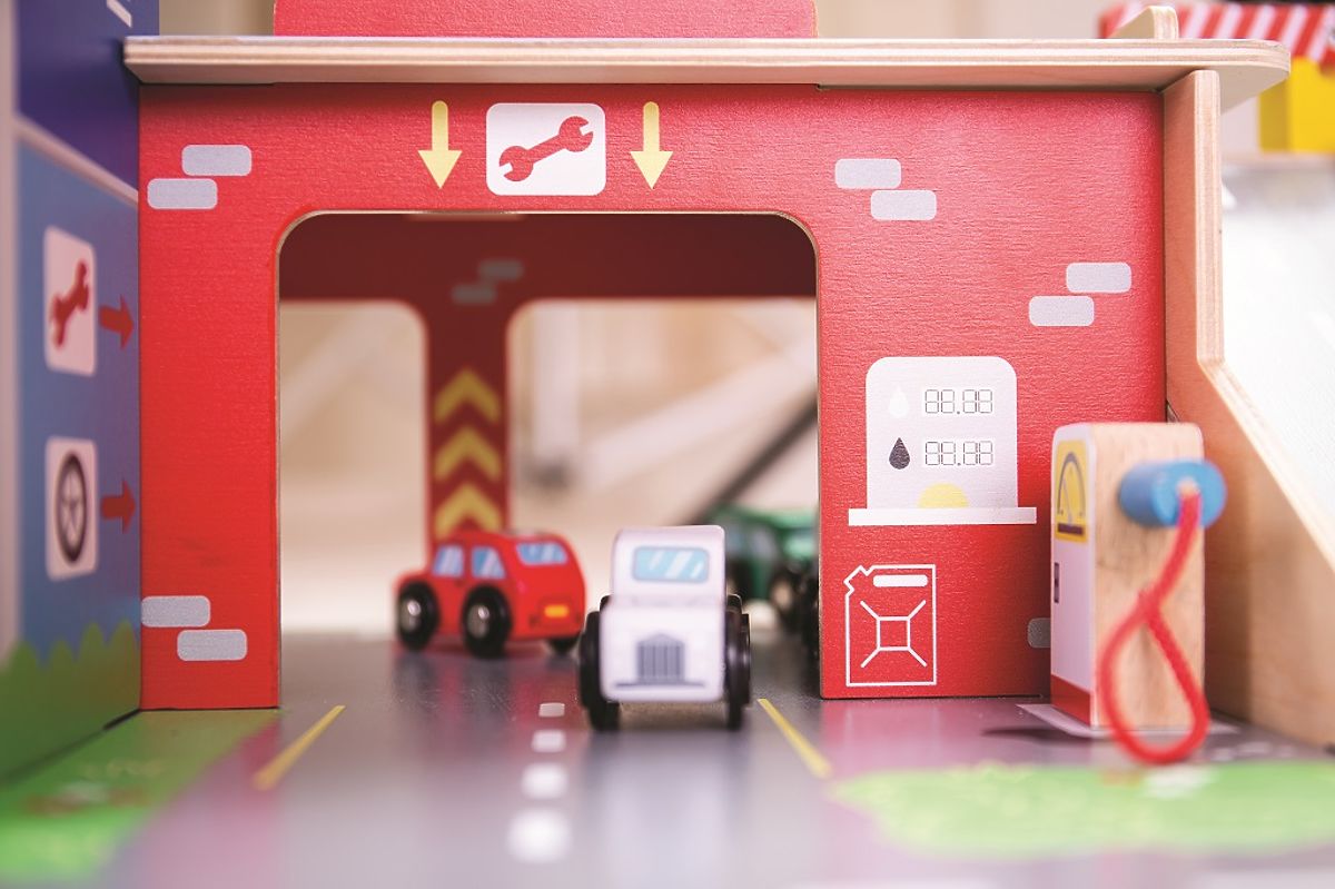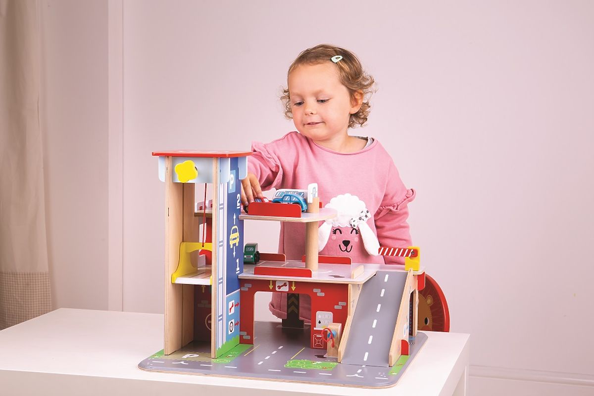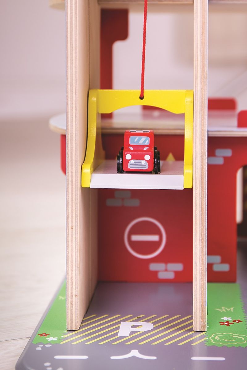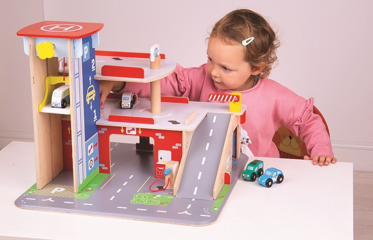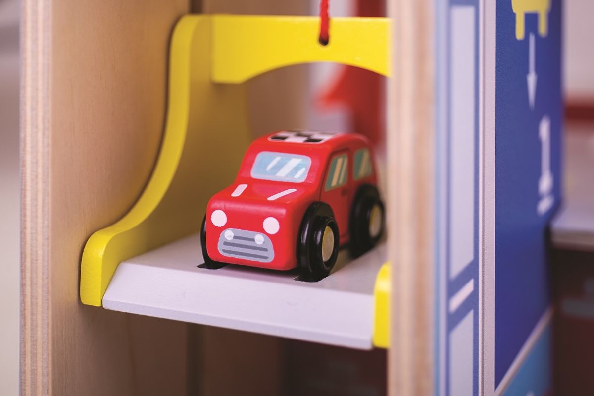 Children will enjoy a fun-filled playtime on each of the three floors of the garage with a parking lot. On the ground floor, they can drive the car onto a working elevator and then go up to the second floor to park. On the ground floor, children will find a service station, car wash, and pump. Cars can leave the first floor using the elevator or the ramp, but be careful, cars must wait for the barrier to lift! The highest point of the garage is the helipad. This garage has everything a little driver needs to get from point A to point B. It supports creativity and imagination. It develops hand-eye coordination, fine motor skills, and dexterity. Can be complemented with Bigjigs Toys and Bigjigs Rail cars. Made from high-quality materials from responsible sources. Main features: 3 floors with parking and helipad, functional elevator, service station, car wash, and pump on the ground floor.