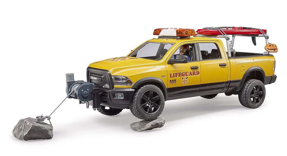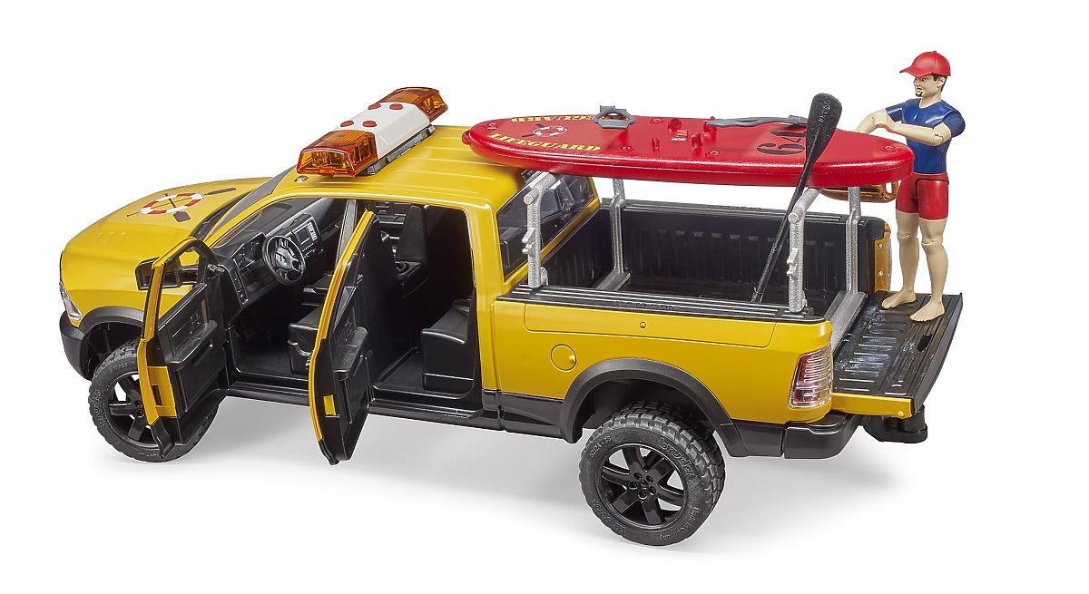 The determined rescuer is ready to overcome any obstacle with the impressive Dodge RAM 2500 Powerwagon that his coast guard duties may present. The rescuer always has his float and paddleboard at hand; equip his vehicle with a winch (not included) and nothing will stop him. Don't hesitate to launch the paddleboard into the water, it actually floats! The vehicle's cabin offers a realistic design compatible with BRUDER BWORLD figures. Made in Germany from high-quality materials. Main features: vehicle with winch hitch, figure, paddleboard with paddle and float, variable cargo space, opening side and rear doors, model steering via extended steering wheel through the roof, suspension axles, removable beacon with siren, light and sound effects, compatibility with BWORLD figures, made in Germany.