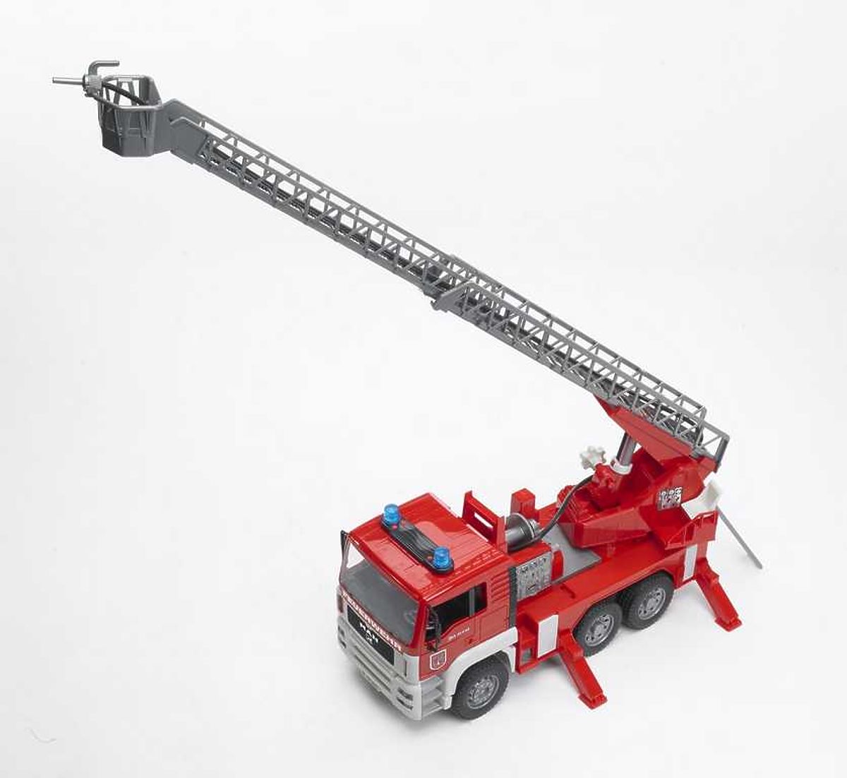 The Bruder MAN TGA Fire Truck with Water Pump is a detailed vehicle model featuring solid profiled tires, a fully tiltable cabin to view the engine block, a fully functional water pump and hose, and most notably, a large extendable ladder. The ladder arm can extend up to 80 cm! The platform with the extendable ladder is rotatable, the cabin mirrors can be folded, and the integrated water tank is easy to fill. Four support blocks ensure perfect stability for the entire vehicle even with the ladder extended. A notable feature of this vehicle is the modern multifunctional module with light and sound. Made in Germany from high-quality materials. Main features: fully tiltable cabin, fully functional water pump and hose, large extendable ladder up to 80 cm, rotatable platform with extendable ladder, foldable mirrors, modern multifunctional module with light and sound, made in Germany.