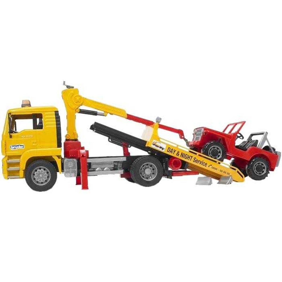 Bruder MAN Tow Truck + Jeep The tow service + Jeep is a tow truck including a jeep. The MAN TGA tow truck features a tilting cabin, allowing a view of the .. more