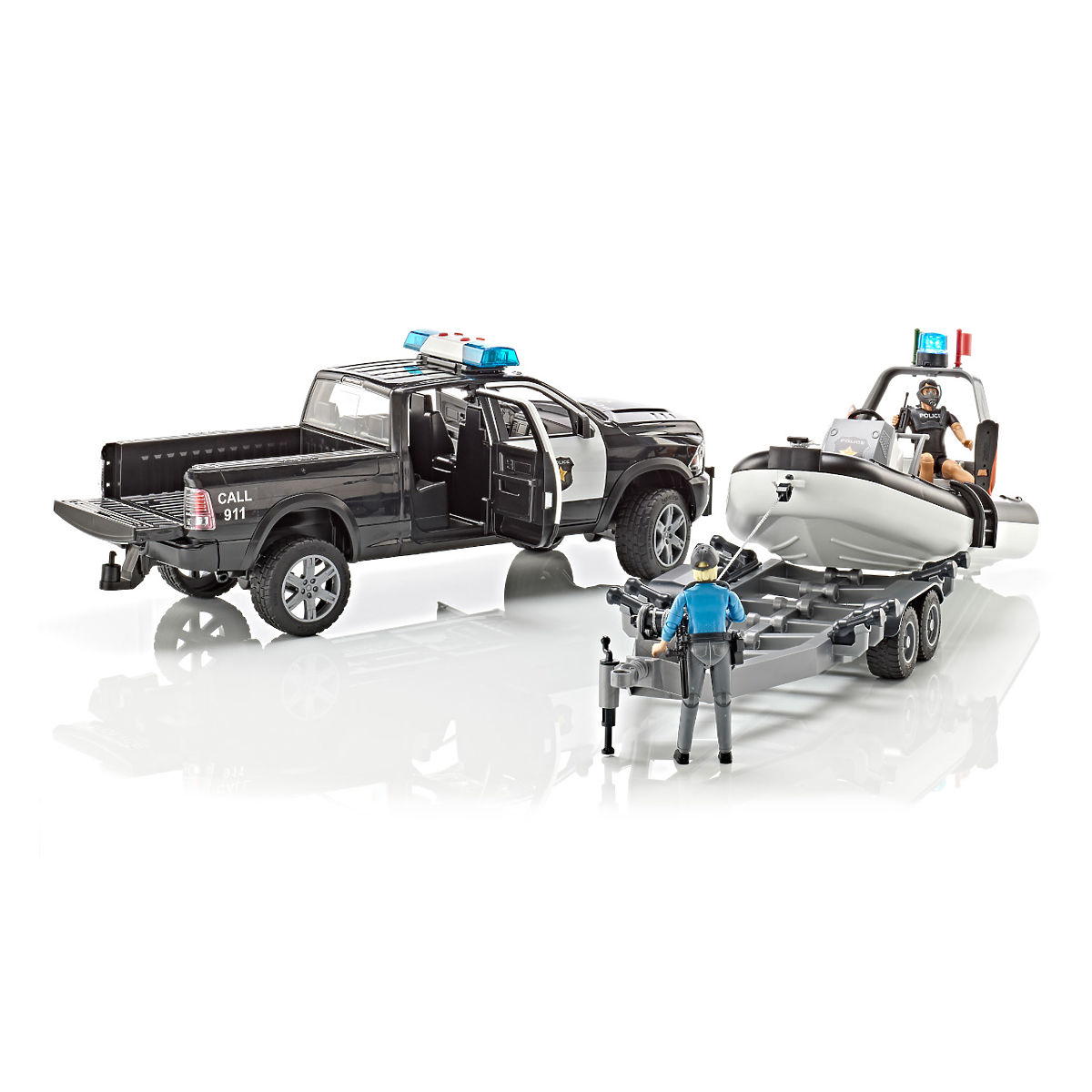 The Bruder RAM Police Vehicle 02507 is based on the well-known RAM 2500 model and features a light and sound module mounted on the roof. Like its real-life counterpart, the toy is equipped with a four-door cabin with opening doors, designed for BWORLD figures. The car has suspension axles and a front steerable axle with an extended steering wheel, which is included in the package. The truck bed has an opening tailgate. No police vehicle is complete without a beacon, and the Bruder 2507 model is no exception. An essential helper for the police in the Bruder world is a boat with a police diver and important equipment, including a beacon. The boat can carry up to 3 BWORLD figures and is suitable for swimming in the bathtub or, for example, in your pool. The Bruder 2507 model package also includes 2 figures, a policewoman and a diver. Main features: The package includes a RAM police car, trailer, boat with accessories, and 2 figures (1x policewoman and 1x diver) Scale: 1:16 Car dimensions: 40x17x15 cm Trailer dimensions: 38.5x16.2x6.2 cm Boat dimensions: 27x12x9 cm Figure size: approx. 10.6 cm Material: ABS plastic, polycarbonate Country of origin: Germany Suitable for children from 4 years old