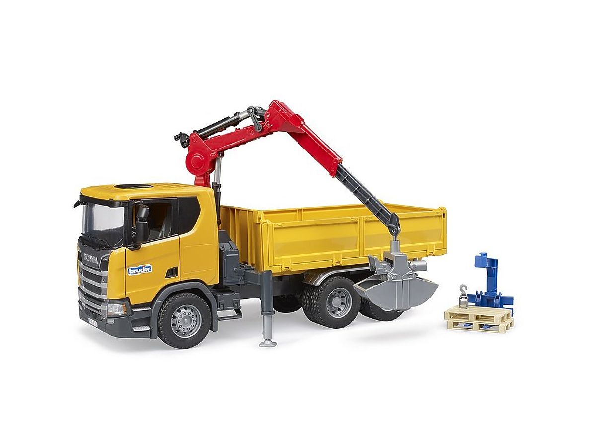Like other Scania models, this one is characterized by its durability and robustness. The truck features opening doors, foldable mirrors, and is suitable for play both indoors and outdoors. The front cabin of this vehicle provides a comfortable workspace for all figures from the bworld series. Behind the cabin, you can see a loading telescopic arm that rotates 360 degrees. For easier loading and unloading, there are foldable side panels and a loading platform. The stability of the vehicle is ensured by support legs. The package includes two pallets, pallet forks, and a grab with a shovel. Main features: foldable mirrors, opening doors, 360° rotating arm, foldable side panels, support legs, foldable platform, suitable for play at home and outdoors, compatible with BRUDER bworld figures, made in Germany, suitable for ages 4 and up.